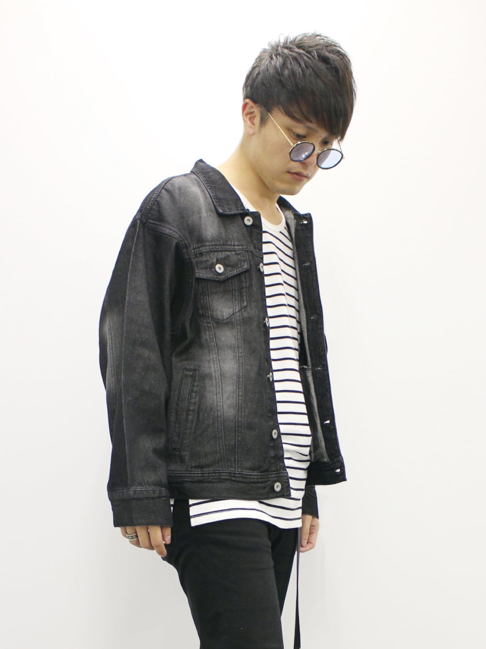ビンテージ感のあるビッグシルエットのデニムジャケットはスリムな黒パンと相性ばっちり! ロング丈のボーダータンクの差しが肝!