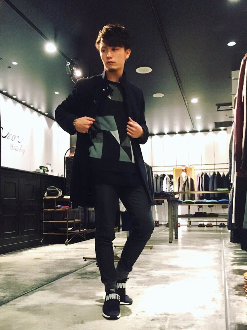 モードなブラックコーデに総柄ニットをイン。 リブパンツで着崩して抜け感を演出。