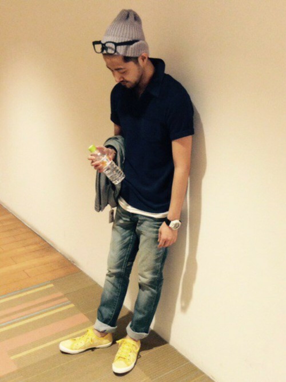 差し色のスニーカーがポイント! 少しでも涼しく着こなしたいコーディネートです。 ヒゲは相変わらず暑苦しい、、、