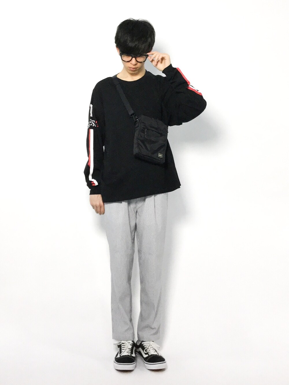 hiroのTシャツ/カットソー「WEB限定 GUESS×FREAK'S STORE/ゲス スーパービッグシルエット 袖ライン プリント 長袖Tシャツ」を使ったコーディネート