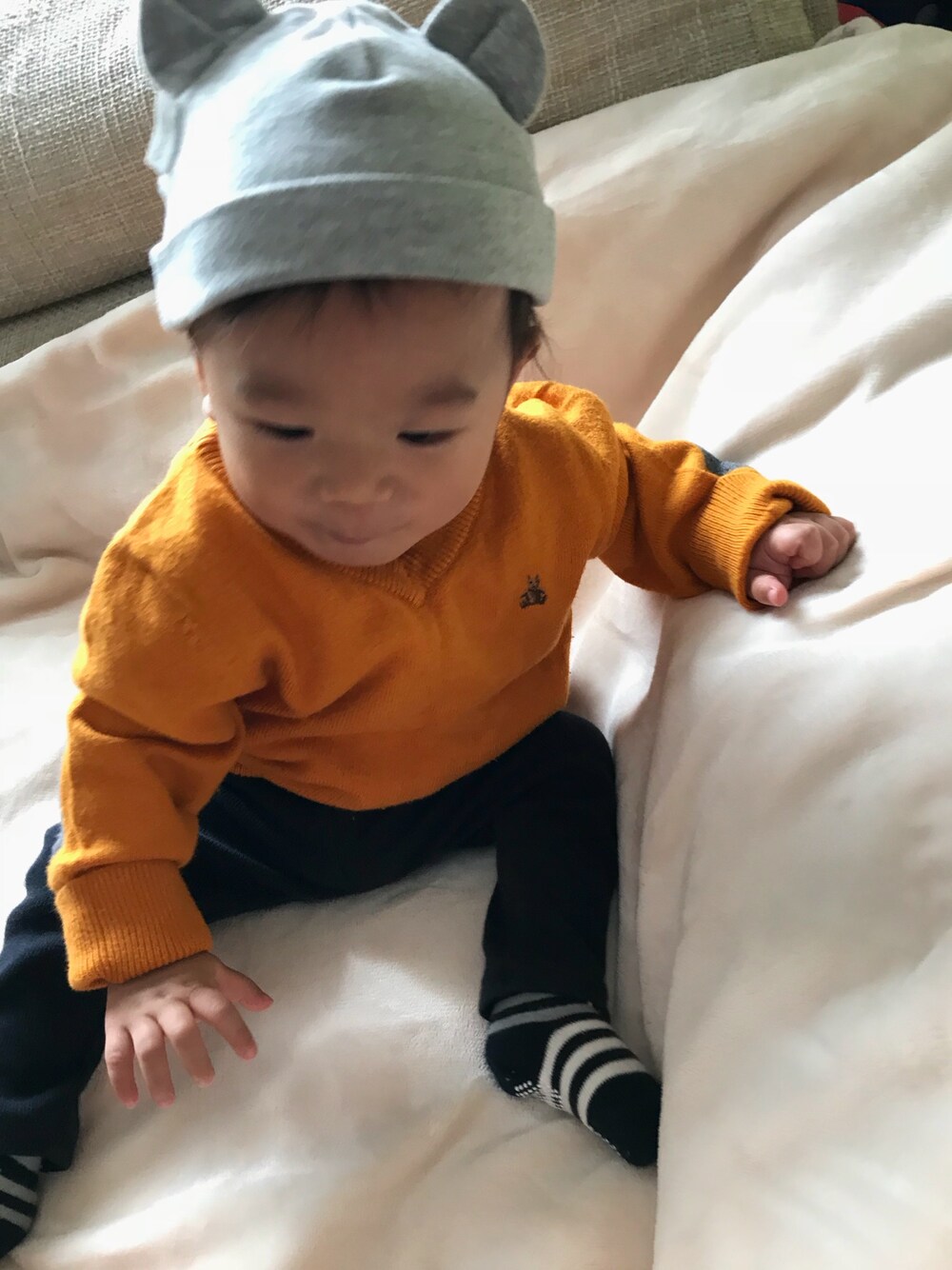 新生児の時に使ってた帽子、無理やり被せてみた(*´-`) GAPのセーターはお姉ちゃんのお下がり♬
