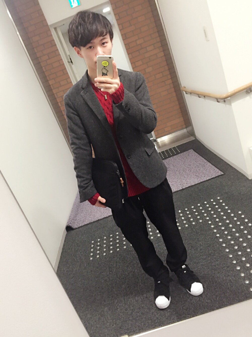 knit #GU jacket #BEAUTY&YOUTH UNITED ARROWS pants #monky time accessory #WEGO shoes #adidas bag #Henschel 大人しめな感じのコーデ? でも、赤のニットが目立つ… スニーカーでよかったのかな?