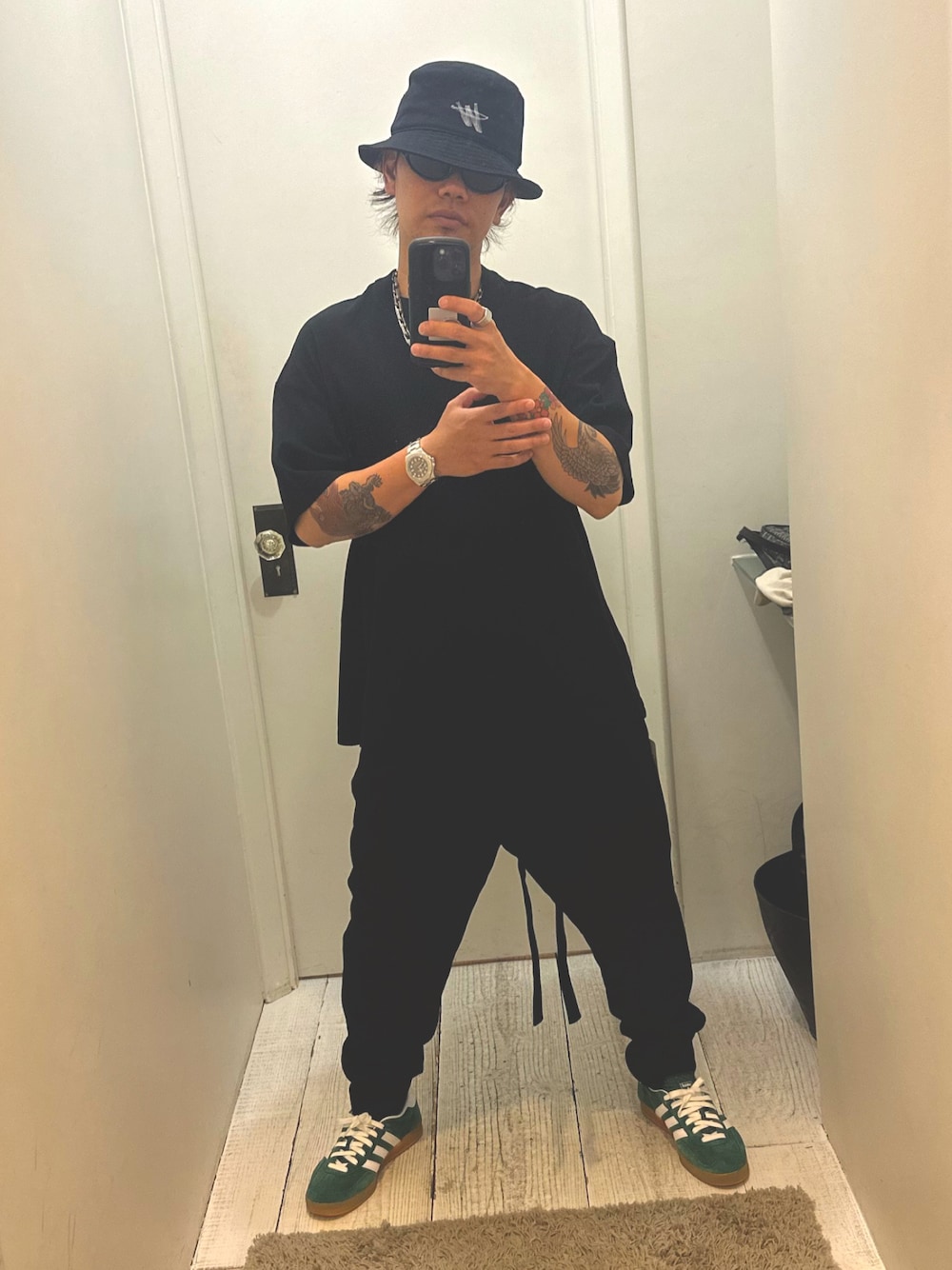 今流行りのadidas、ガゼルのグリーンを合わせてみました! バケットハットの相性もいい!