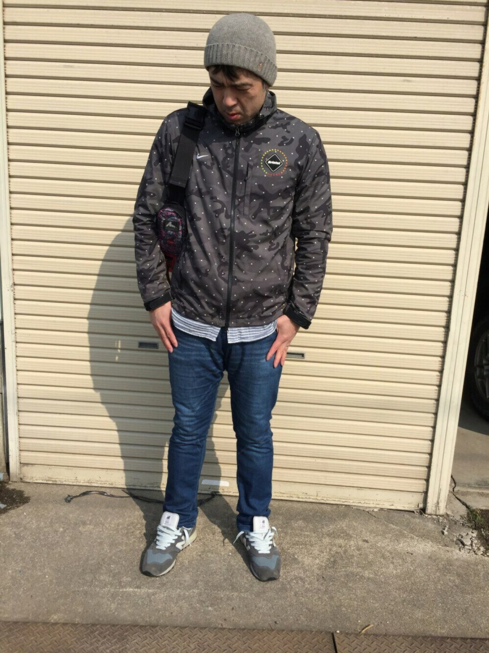 雪国はまだ寒く、防寒具が必要です。 ブリストルのジャケットとフェイクデニムのスエットで。足元は雪が無くなりやっと履けたスニーカーNBの1300でお出かけです!