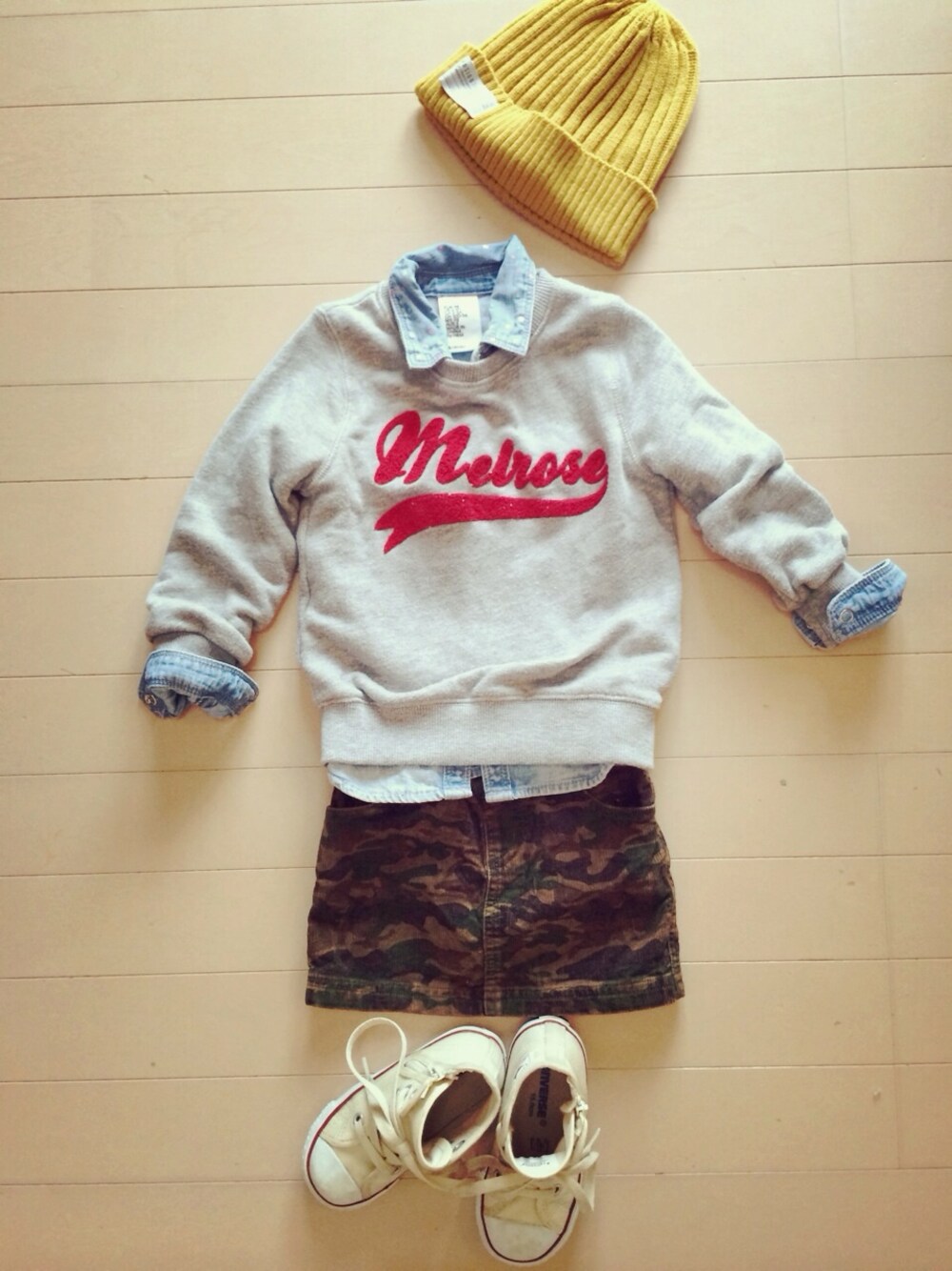 次女さんコーデ*まとめてUP スウェット*ZARA シャツ*H&M スカート*green label relaxing 靴*コンバース ¨̮⑅