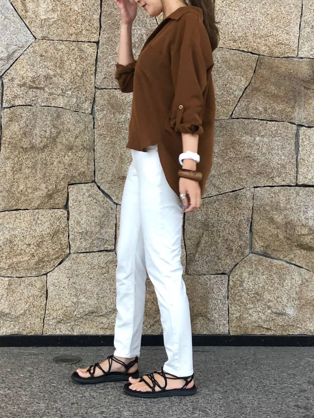 ご覧頂きありがとうございます😊🧡 たまには大人なシャツに ホワイトデニムで🤍🤍🤍 足元はスポサンで外してます🙆♀️ ブラウンシャツは 雑誌VERYのスタイリスト 小山田早織さん✖︎EDWINの コラボ商品😍❤️ 大人女子の魅力を引き出してくれます💃 前が短め後ろが長めなので お尻はすっぽり隠れますよ✨ 後ろverも載せてます☺️💓