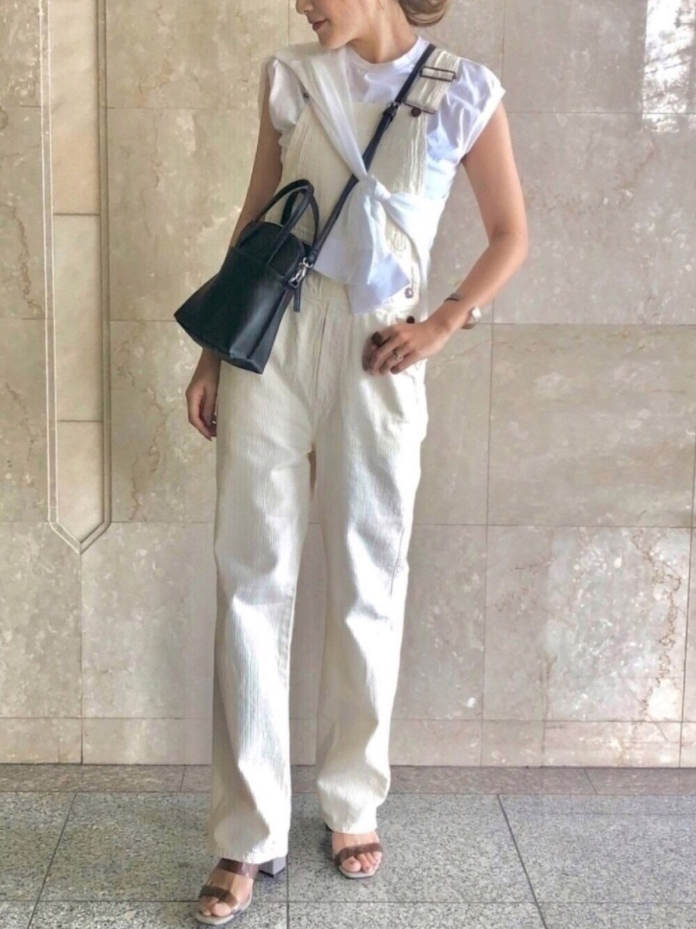 ご覧頂きありがとうございます🤍 #ホワイトコーデ🤍🤍🤍 結局ワントーンコーデに落ち着きます🙃🌵 サロペットはsomething🌿 子供っぽくならない、程よいスリム感が 大人女子にはgood🥰 ジーユーのシアーシャツワンピは ポイント使いも有りです❤️