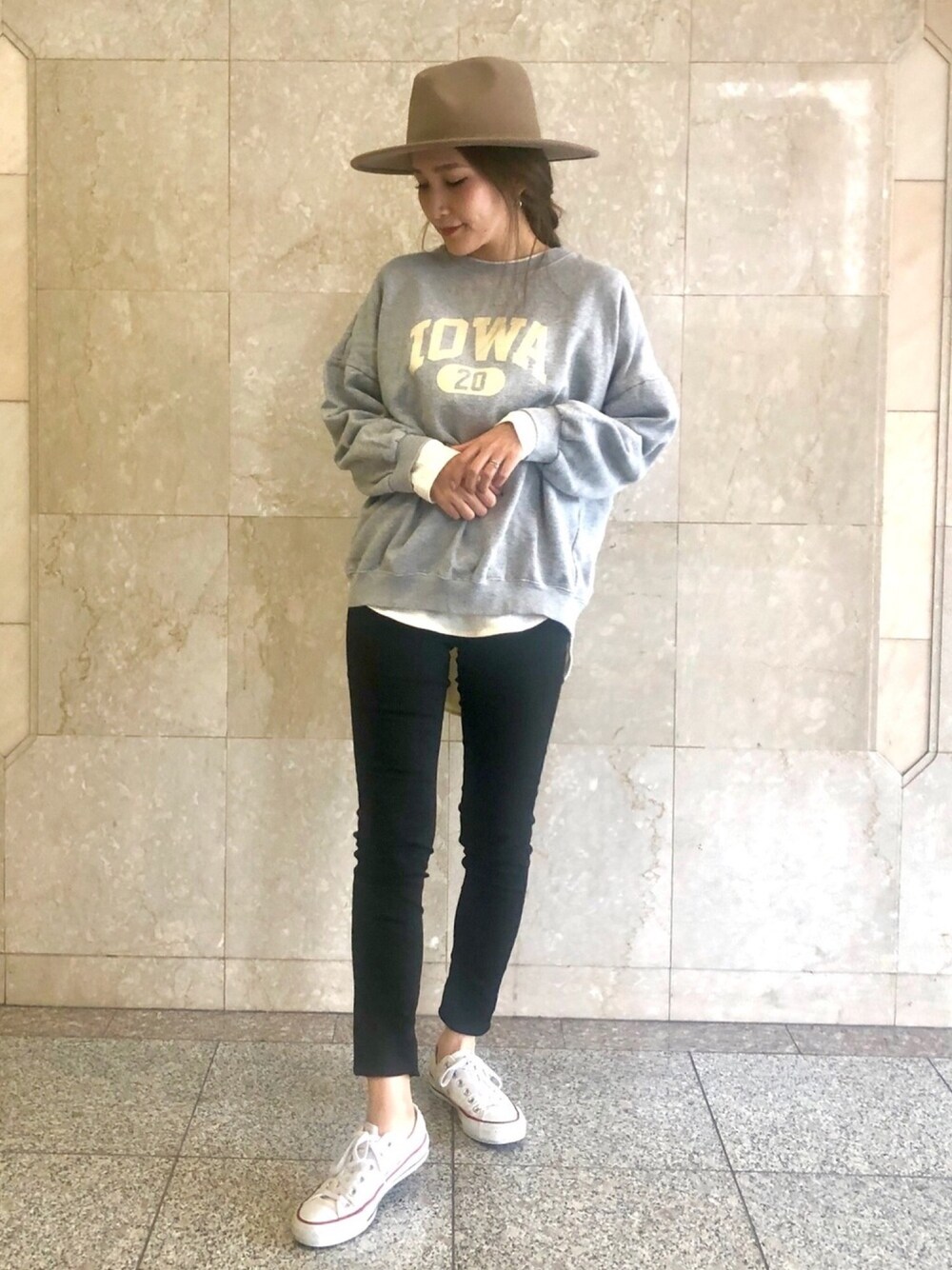 ご覧頂きありがとうございます🧏🏻♀️🌈 #スウェットコーデ🤍🤎 シンプルなスウェット大好きすぎる💓 レイヤードに最適なロンTに 足元はスッキリスキニー🖤 どシンプルやしメンズライクなので ハットに三つ編みで 女性らしさをぷらす🧏🏻♀️❤️ ママの休日コーデでした👩👧👧✨