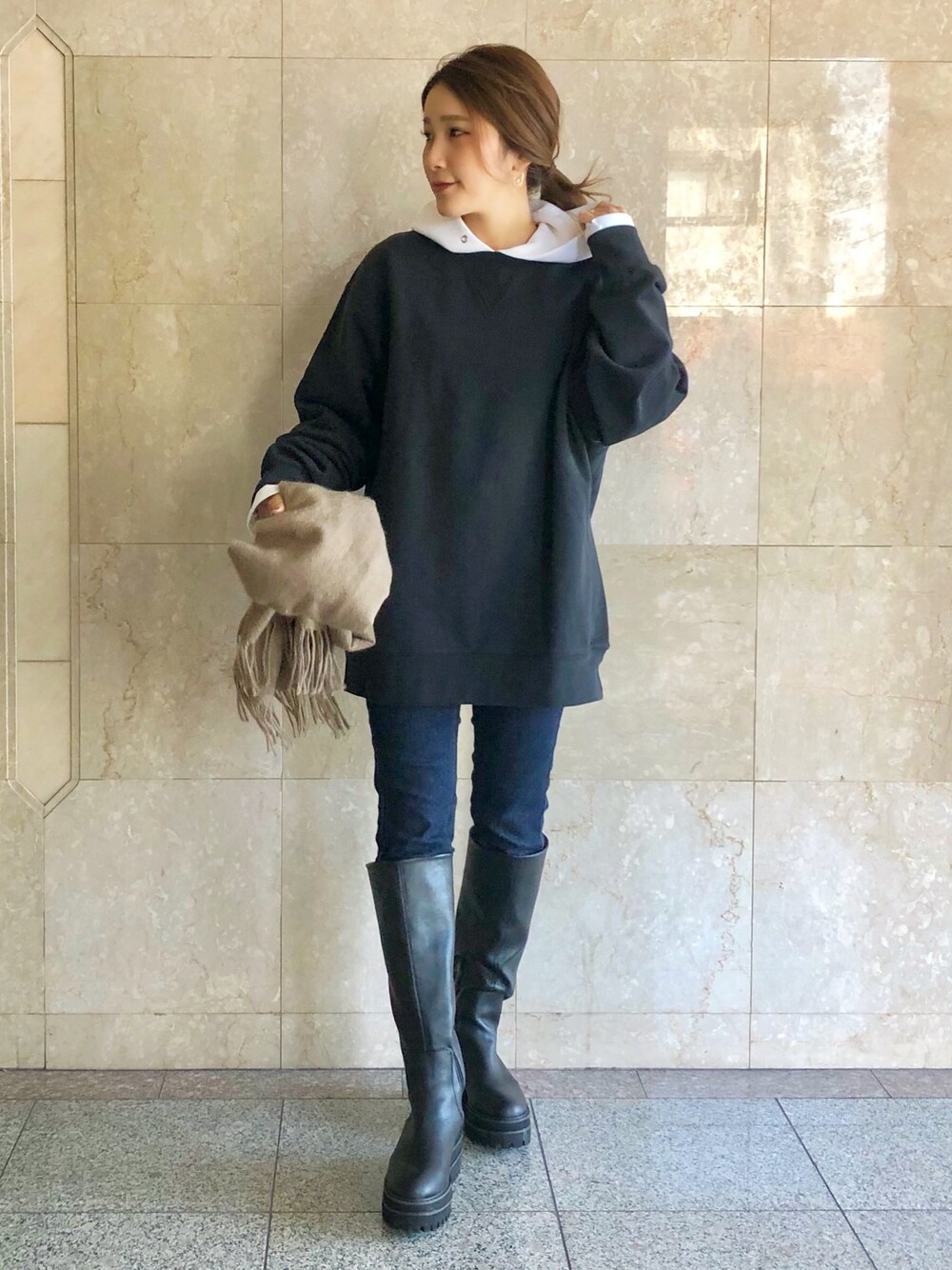 ご覧頂きありがとうございます🖤 休日の楽ちんママコーデ🙏❤️ スウェットはヴィンテージ仕様の 直営店限定アイテムになります☺️🖤 men'sXL着用で 中にパーカーをin👌 大きめなのでインナーで色々遊べそう🙆♀️ 足元はキレイめスキニーに ロングブーツで締めてます🥰❤️