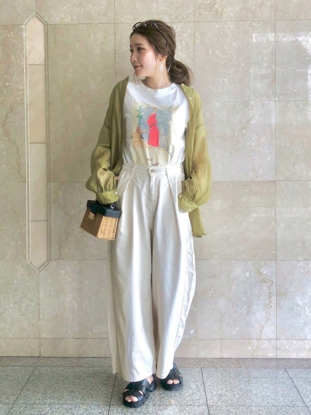 ご覧頂きありがとうございます❤️🌿 ✔︎キレイめカジュアルコーデ zaraのお気に入りプリントtに おnewのタックワイドパンツ🤍🤍🤍 リラックスマインドな穿き心地で 好きなやつ☺️🌿 タックがある事でウエストスッキリ☺️🌼