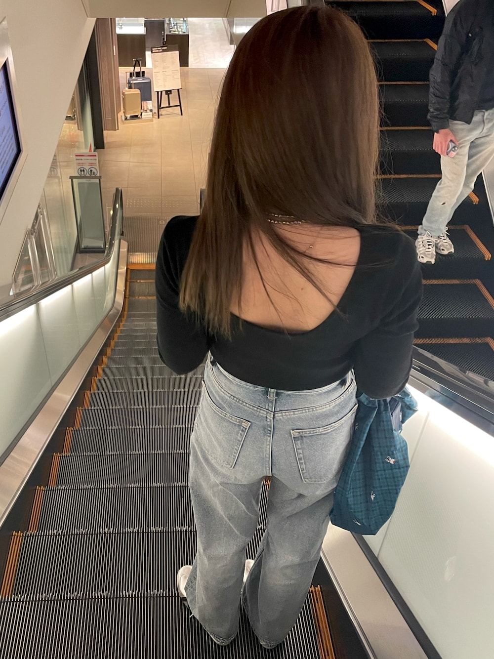 バックオープンがいいけどブラ紐見えちゃうしな〜て方にオススメなtops🖤 普通のブラでギリ見えません👏 デニムはスタイルアップ神デニム♡ 本日クーポン出てます(⑅ˊᵕˋ⑅)