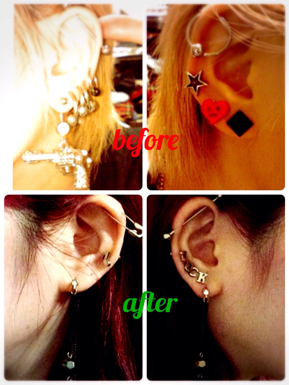 ピアスを変えたい 総とっかえを決意 もう10年くらい きったねーボディピつけっぱ 大人計画としての さよならボディピ 結果 耳穴全部埋まる 拡張してあったからなのか 左耳はフリルみたいに波打って 文字が曲がること風の如し 綺麗に並ぶ様開け直す? 安全ピンピアスは 少しだけ残る 反骨精神