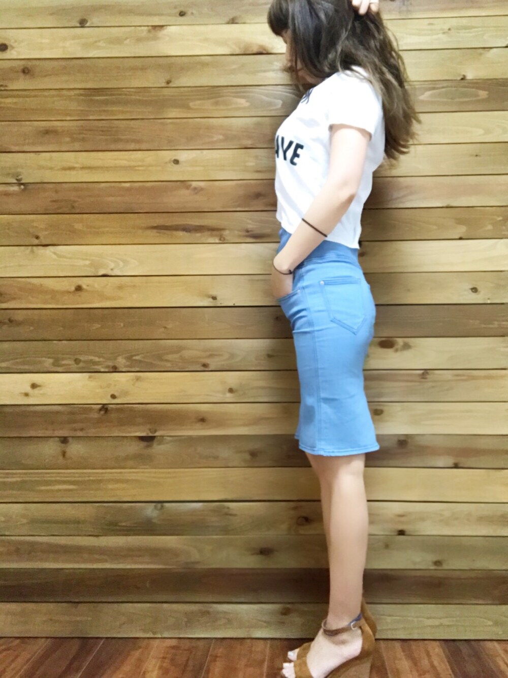 短め丈のザラのTシャツに、ハイウエストのデニムスカートでカジュアルにコーディネートしました♬ このスカートはストレッチするのでとっても動きやすいです♬ タイトなのに歩きやすいので最高です!