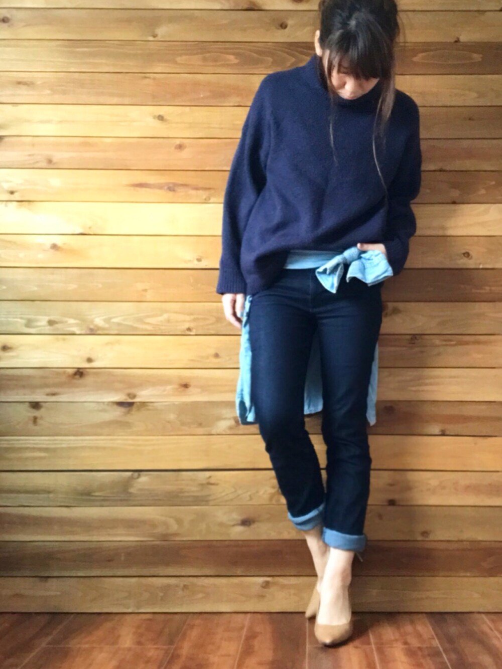 デニムに合わせたネイビーのニットと、デニムシャツでブルートーンのコーディネートにしました。 パンプスはベージュで足がキレイに見えるようにしています! スソをまくって春っぽく♬