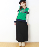 スポーツ観戦にピッタリ! 動きやすいTシャツと、スウェット素材のマキシスカート♬腰に巻いたデニムシャツでいざという時に日焼けも防止♬ 足元はカジュアルすぎないけどローヒールのサンダルで。