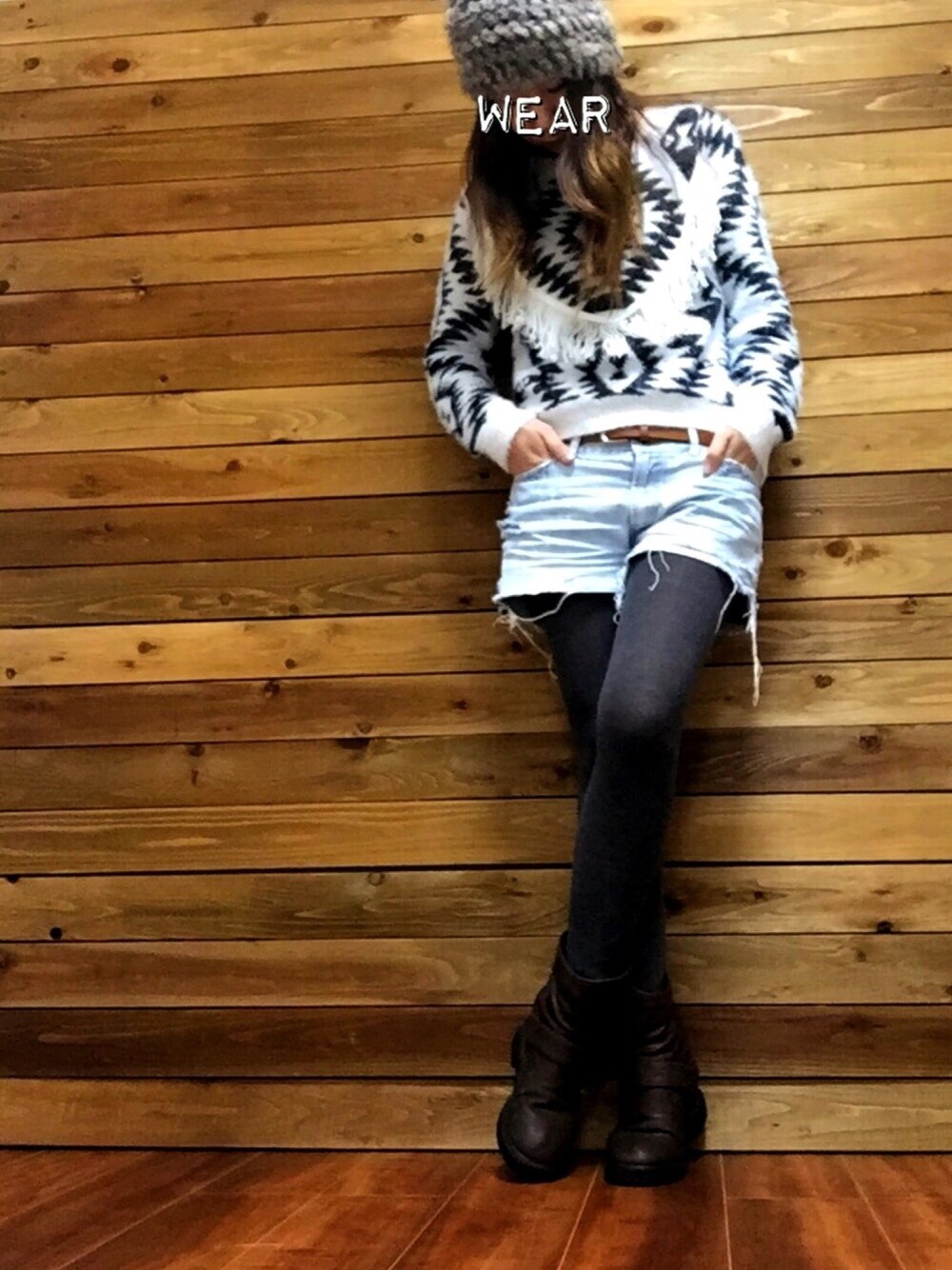 冬だけどショートパンツにしてみました。 私の住んでいるところは寒いのでグレーのタイツです。 ニットがフワフワなので、デニムでボーイッシュにしてます♬ ネイティヴ柄なので、ファーキャップを合わせると民族っぽくなって好きです♬ 足元はヒールじゃなくて、メンズっぽくが好きです♬