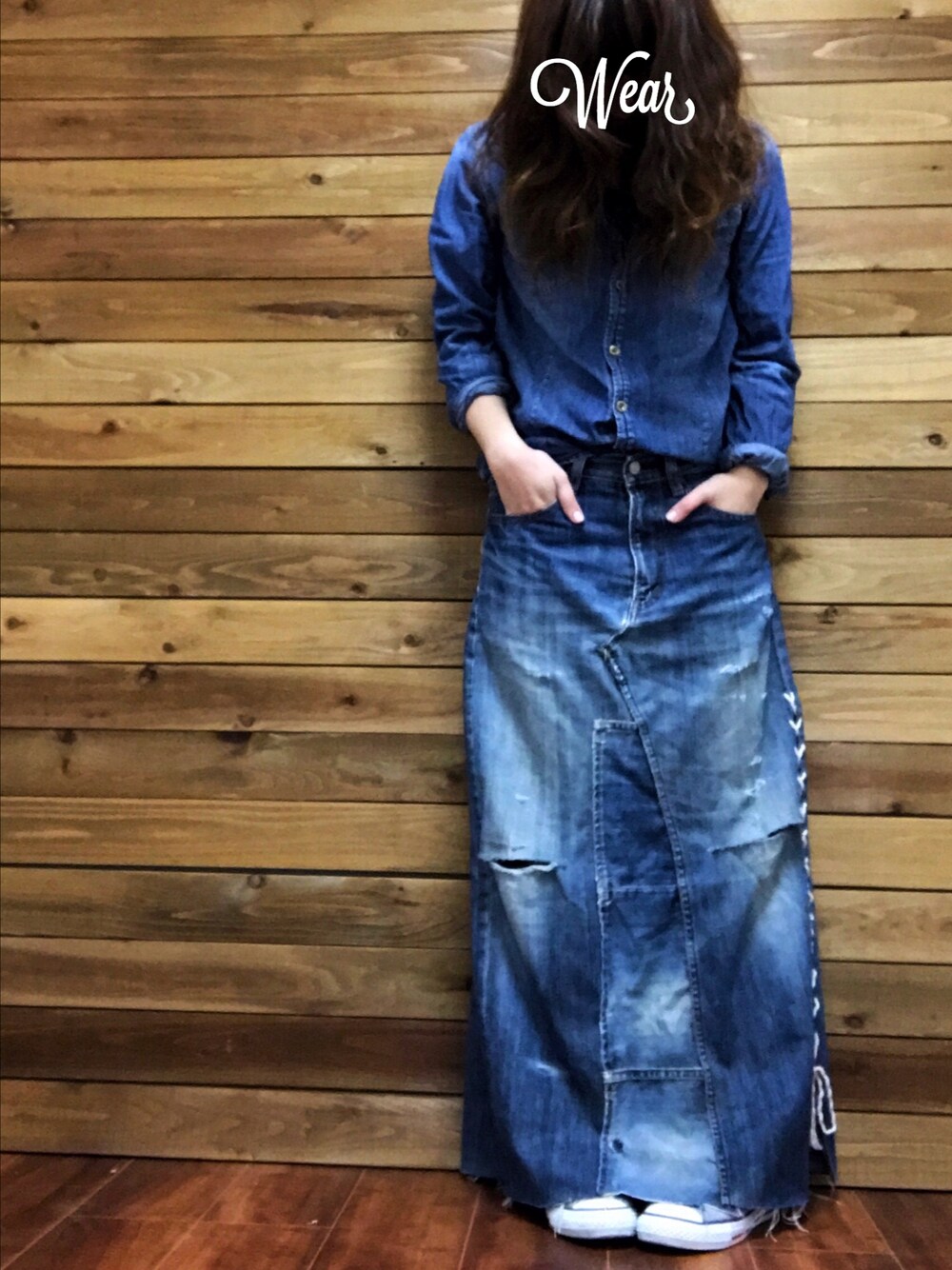 メンズのデニムパンツをリメイクしました。メンズなので、腰で履けます。 デニムオンデニムにしたので、楽です。 花見にも海にも行けるスタイル。