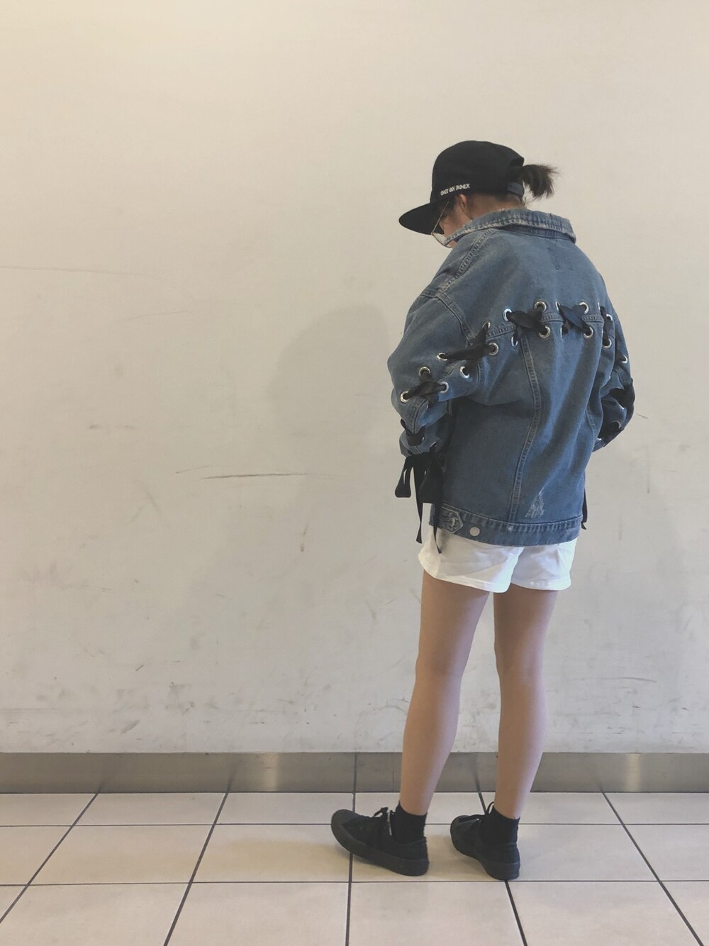 地元の友達とご飯🍽 昔からの友達だし可愛すぎないコーデにしました💪 デニムジャケットはリボンが付いていてカジュアルすぎません☆*。 キャップは大好きなワンオクのライブで入手しました🤘