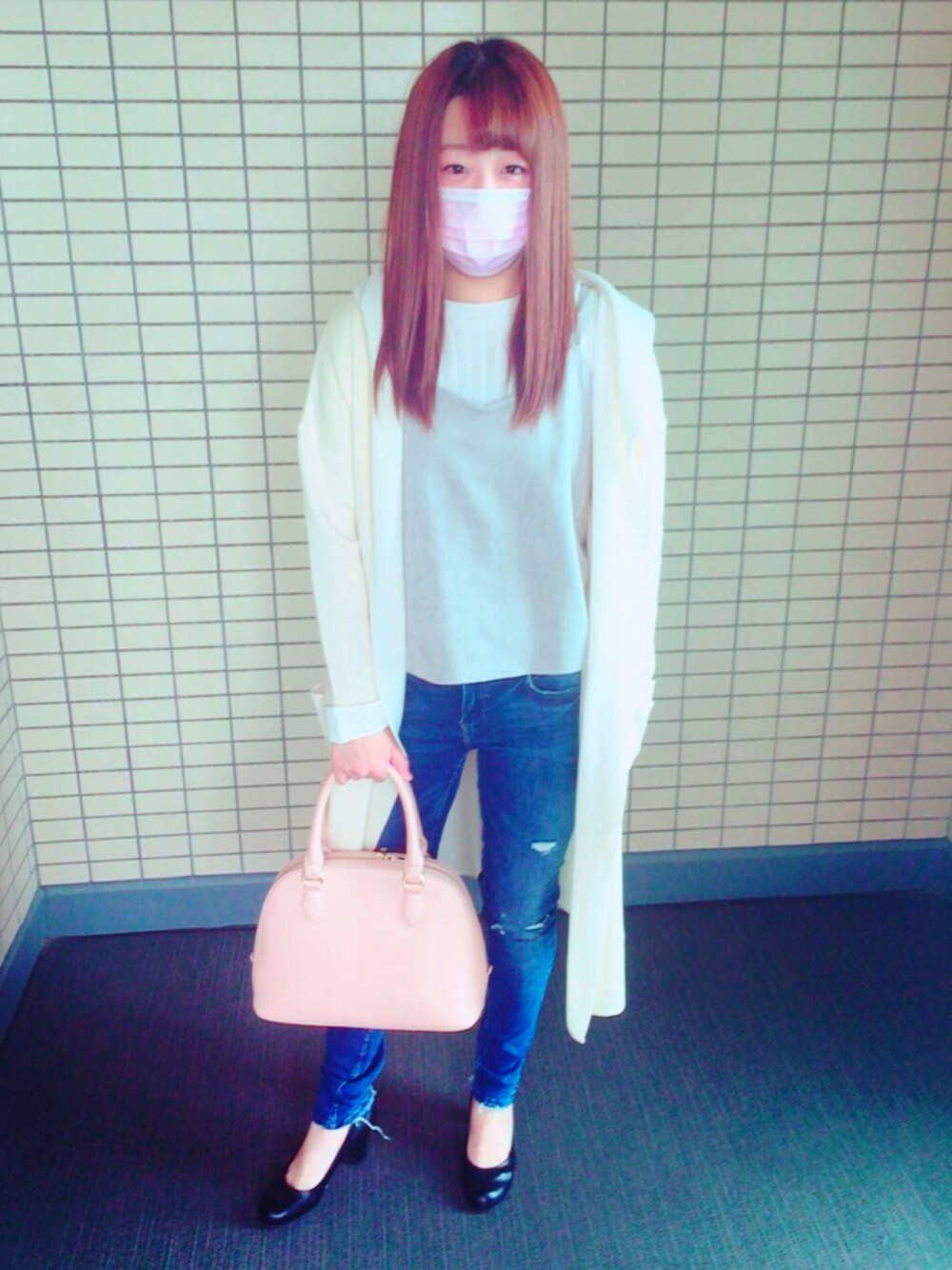 最近買ったばっかりのbagピンクっぽいベージュで、ちょっと女らしさを💁🏼 いつも男っぽいんでね😆笑 友達から誕プレでもらった、 これから使える素材のコーディガン♡ たくさん使うよん✌︎♡ 花粉症っぽいからマスクマン😷