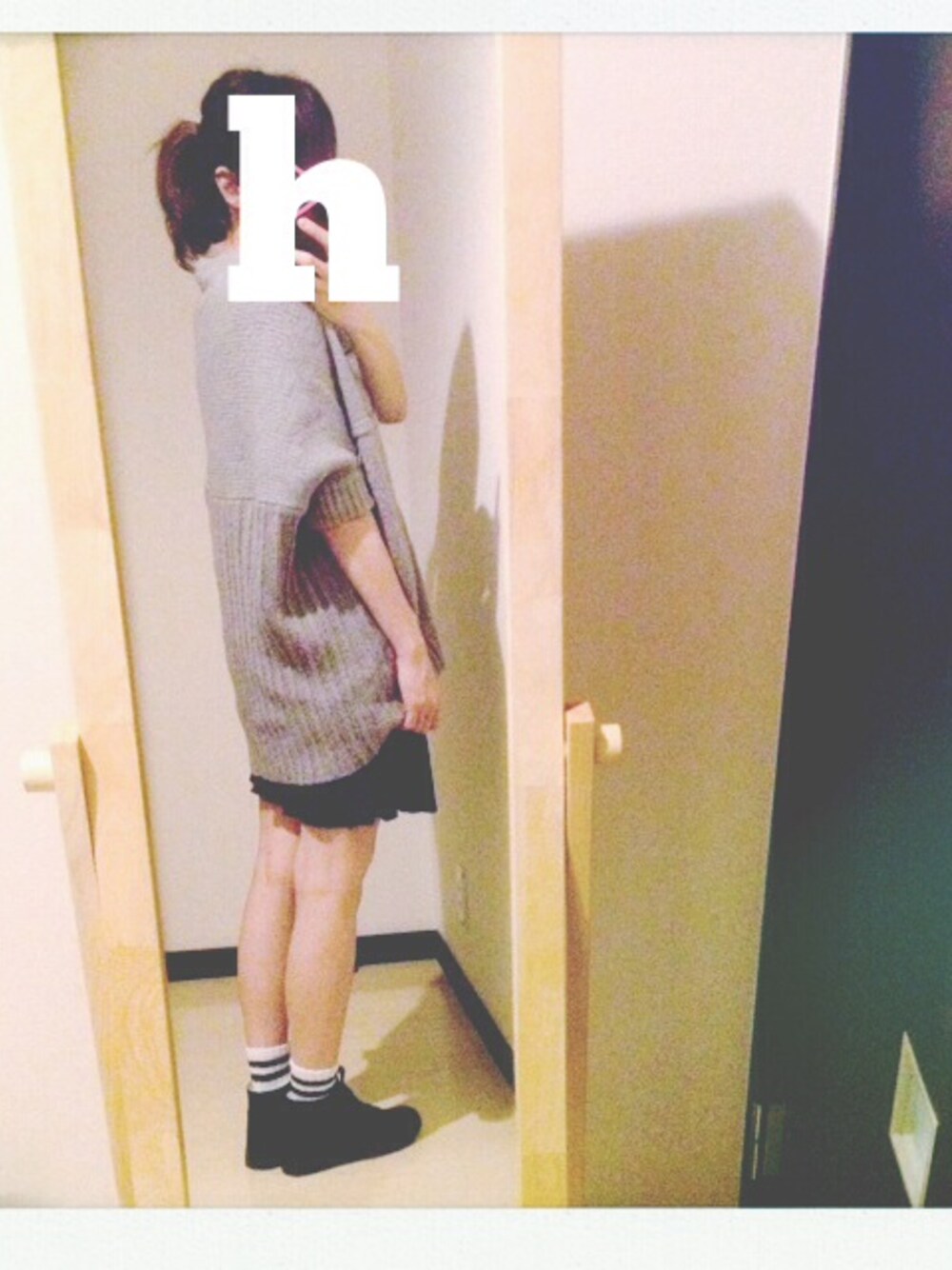 ブラック系のスカート、グレー系のニット/セーターを着用したレディースの春コーディネートの1枚目の写真