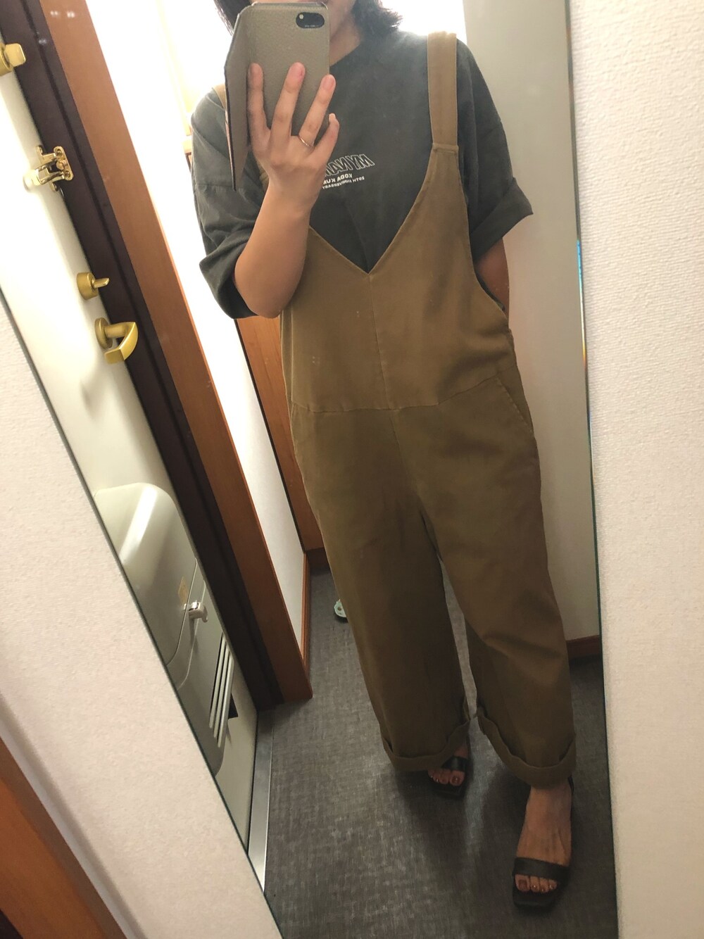 サロペットコーデ🤎 なんて楽ちんなんだーーー! 暑すぎて半袖にサンダル🤣🤣 夏やん😎笑笑 こないだまで寒すぎて、ヒートテック着てたし、今年秋服出番ないっ😑🍂🍂