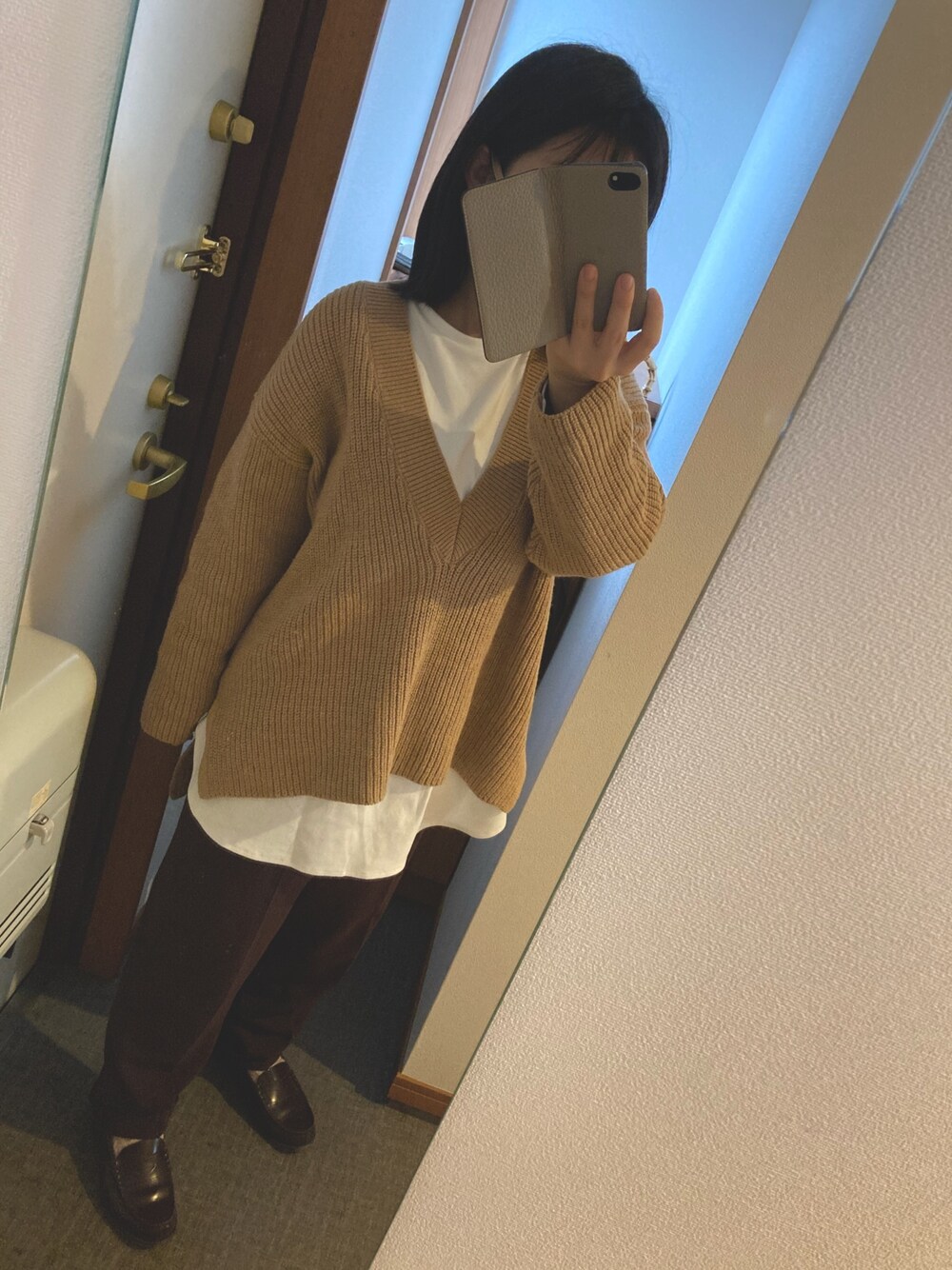 つかの間の春コーデ🌸 VネックのニットがSALEで半額になってて、買ったよ👏🏼 カットソーとセットで4,000円❣️ 生地もしっかりしてるし、 長く着れそう◎←気に入った服は流行りとか関係なくとことん着てしまう派です🙇🏻♀️ 早く春にならないかなぁ🐥
