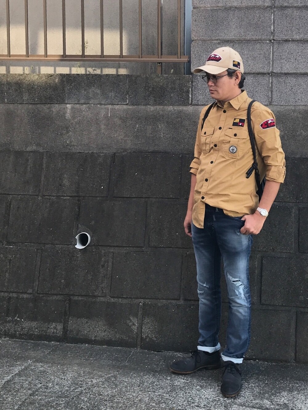 休日のお気楽なコーデ シャツとキャップのワッペンがお揃い Joggは千葉ペリエ オープン限定のTHAVAR SP-NE バックパックはボロボロのお気に入り