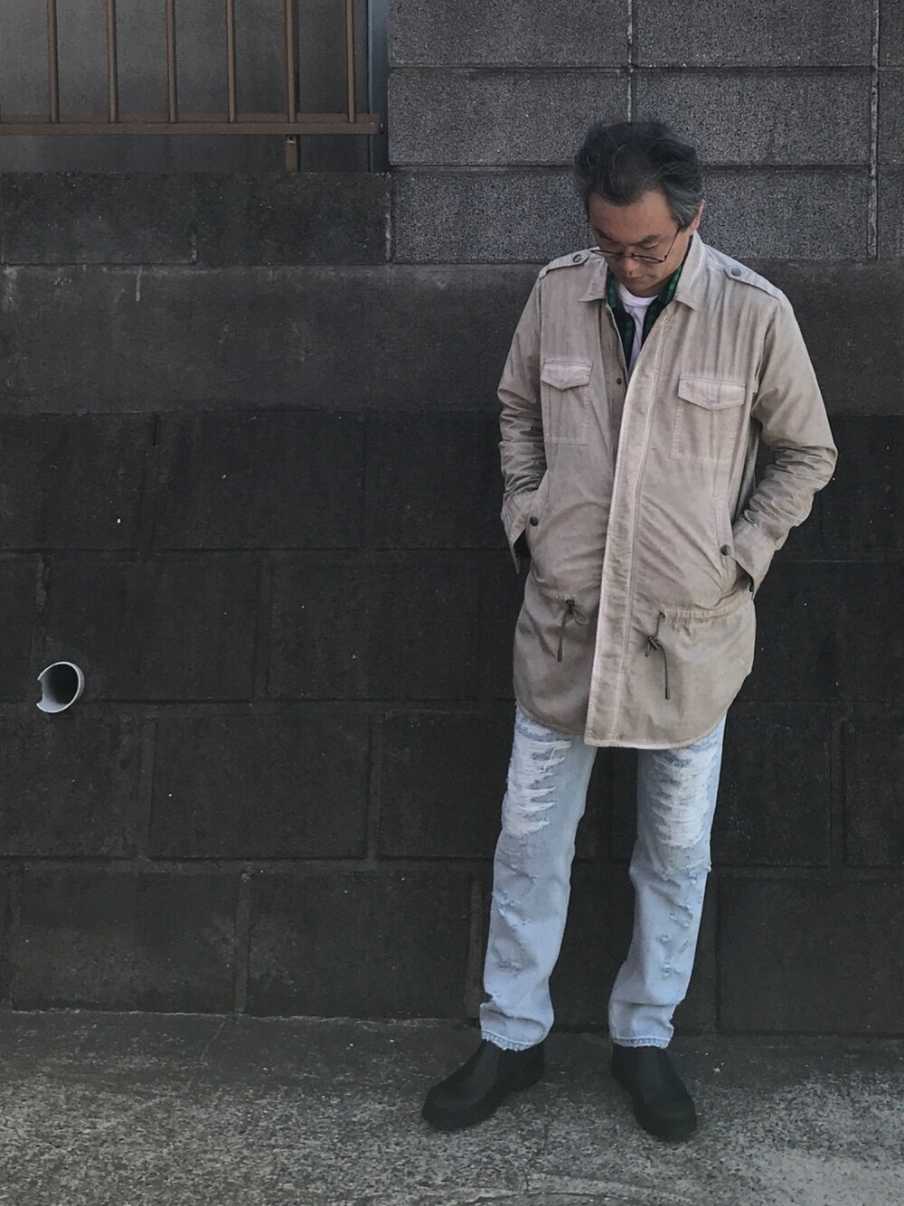 春陽気のワンマイルコーデ M65風の汚shirt 雑誌Smartで草なぎ剛が履いていた denimとは知らなかった。 インのシャツはピンク系チェック👚にしたかったけど、チョット寒かったので、厚めで軽く羽織れる物をchoice まあ見えないからいいけど!