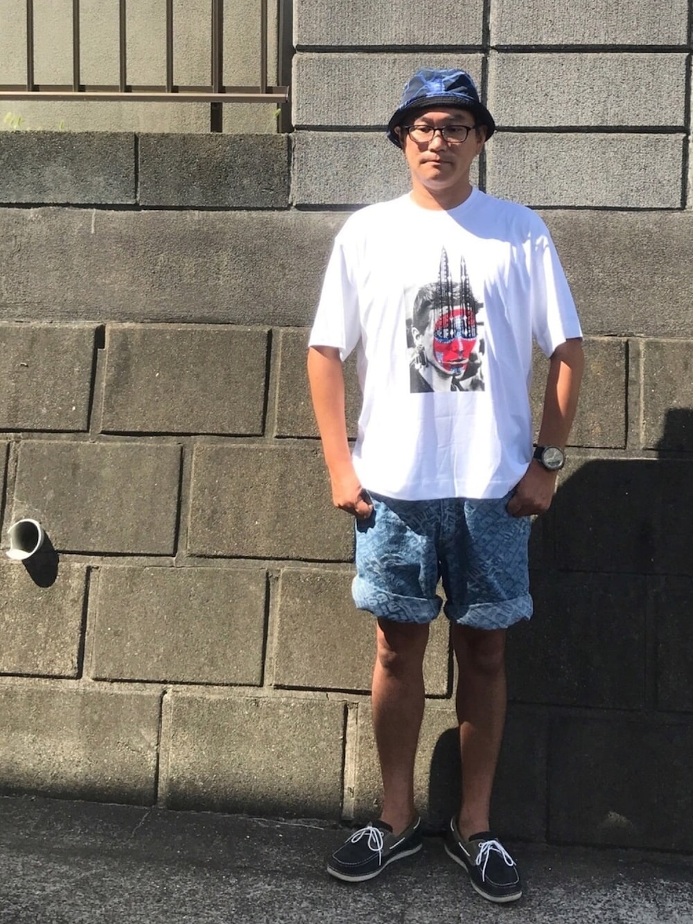 暑過ぎでコーデ出来ない この年齢でもロールアップ ハーフパンツダサくて結構 ワンマイルコーデだからね TシャツはビッグシルエットでなくわざとXLにしてます。目から上にある黒く伸びているのは刺繍で出来てます。