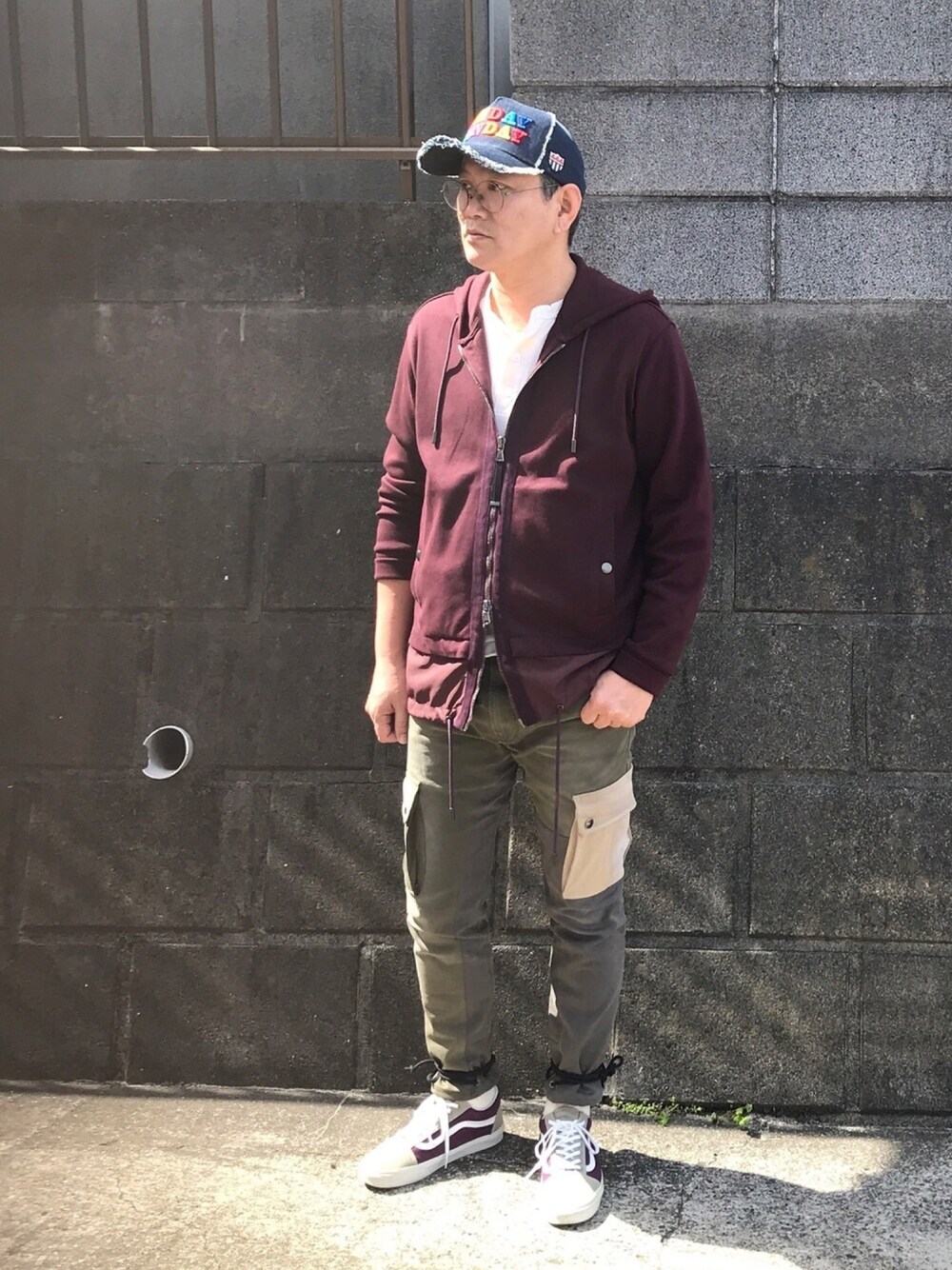 お気軽コーデ UP-CYCLING DENIM を組みあせたカーゴパンツ Vansはパーカーとパンツの色を拾ったカラーの物をチョイス