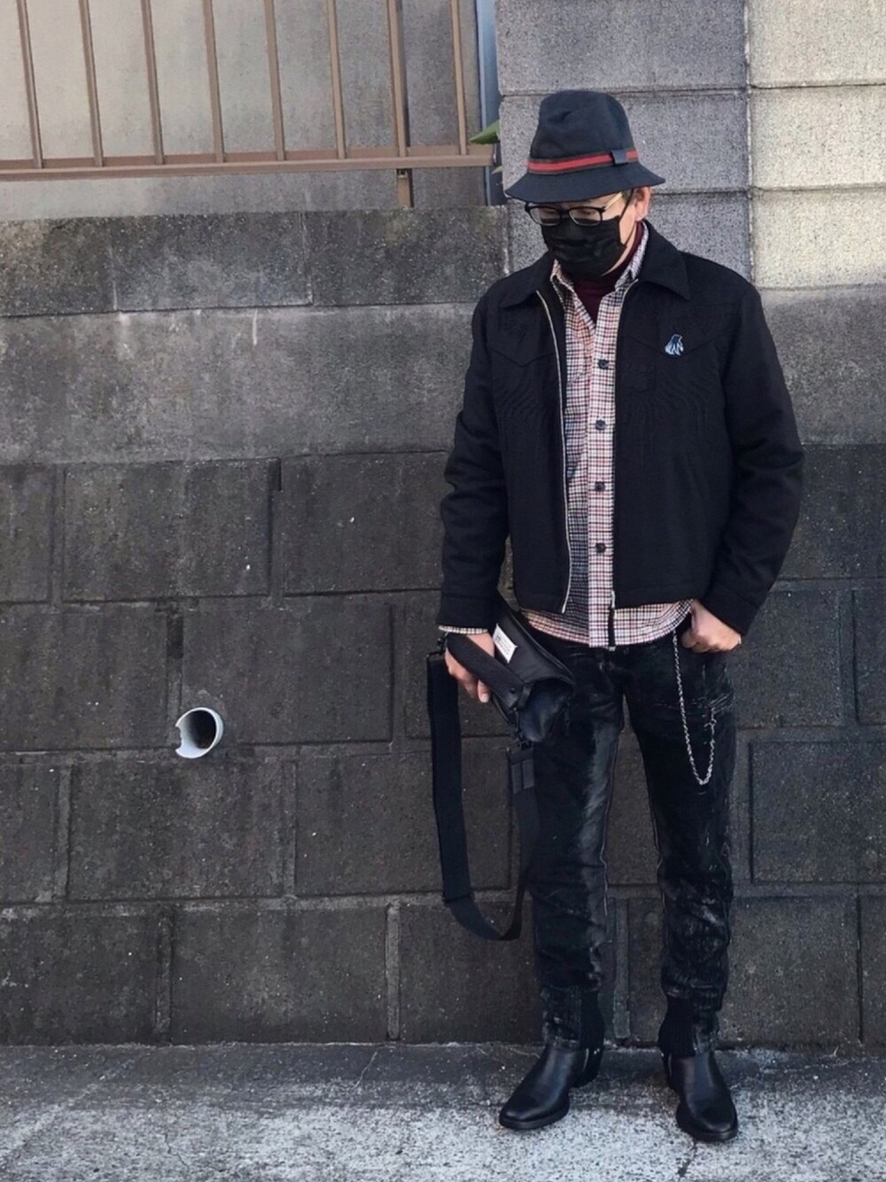 タートルネックニットにシャツジャケットをジャストサイズで羽織り、ウールジャケットを使ってレイヤード Black denim👖にベロア加工、裾は一部リブニット仕様のバックポケットが変わったパンツ bagはMaison Margiela 5AC