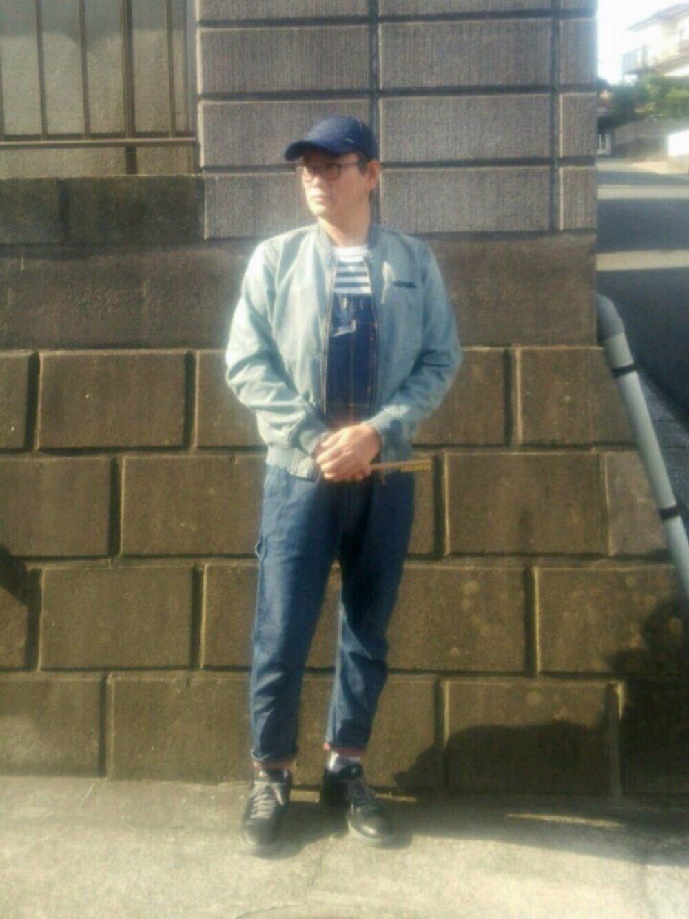 休日のちょっとしたD.I.Yコーディネート 作業時はジップアップします。 ちなみに手に持っているのは真鍮ブラシです。