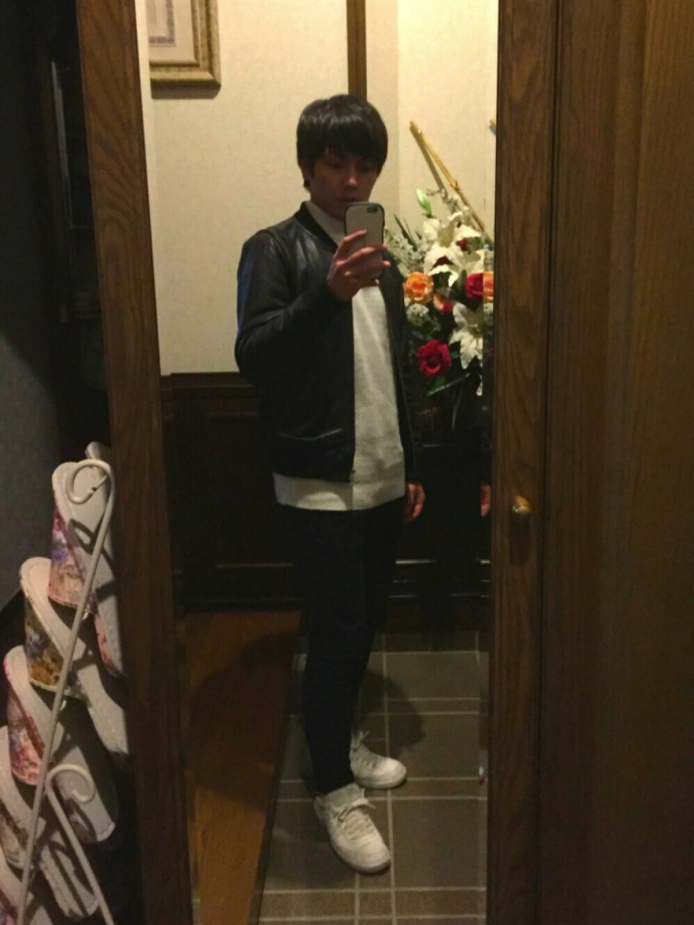 自宅の玄関での写真! 夕方撮ると薄暗くてよく見えないね笑 朝時間ないときはこのスタイルが多め! 白ニットに黒のブルゾンを合わすのが大好きですwww