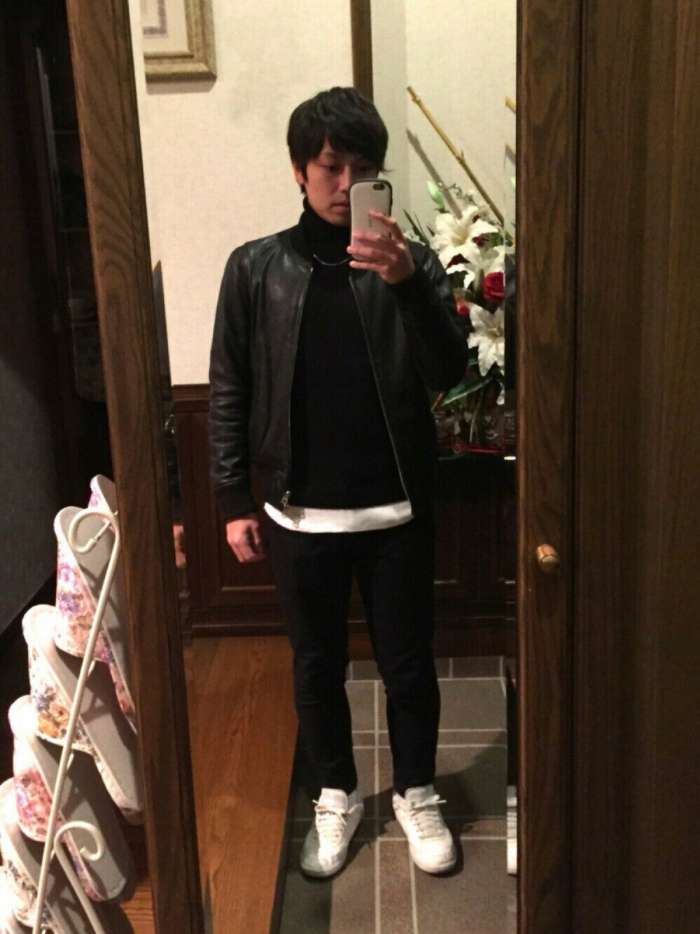 自宅の玄関での写真! 黒のブルゾンは何にでも合うから冬はヘビーローテションになっちゃうよね!www タートルネックはシンプルで好きだわー! 最近のオススメはシルバーチェーンネックレス… 首回りのワンポイントに最適だな!