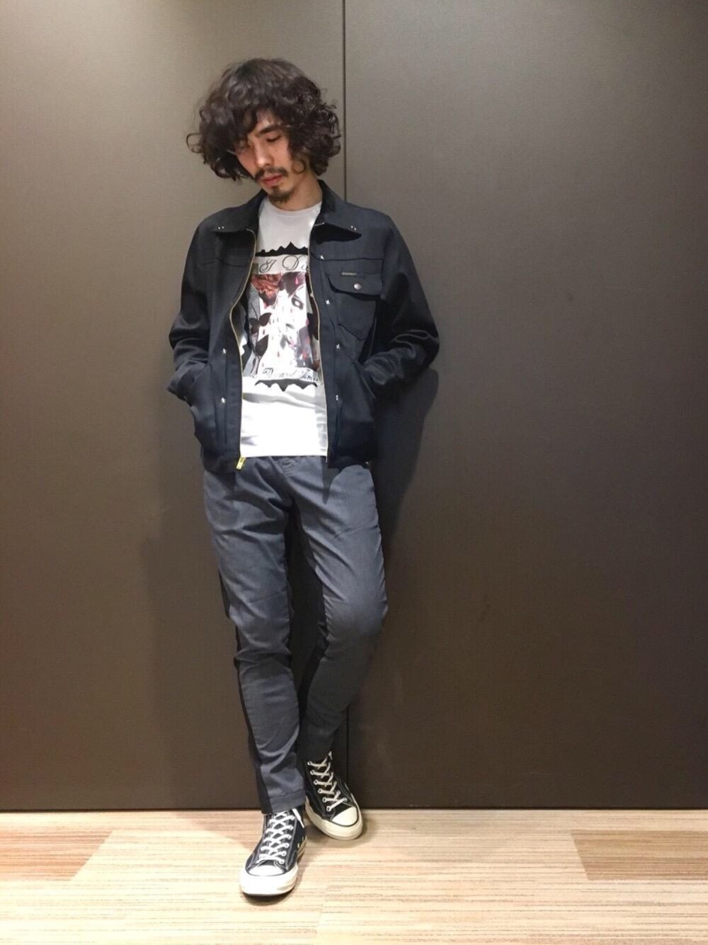 ブラックGジャンに、グレー×ブラック切り替えパンツで大人のモノトーンコーデ。