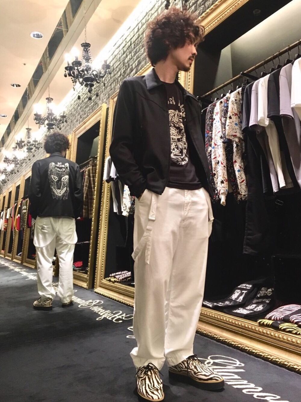 サスペンダー付きのパンツに、背中の刺繍が効いたウエスタンジャケットで大人カジュアルコーデ。