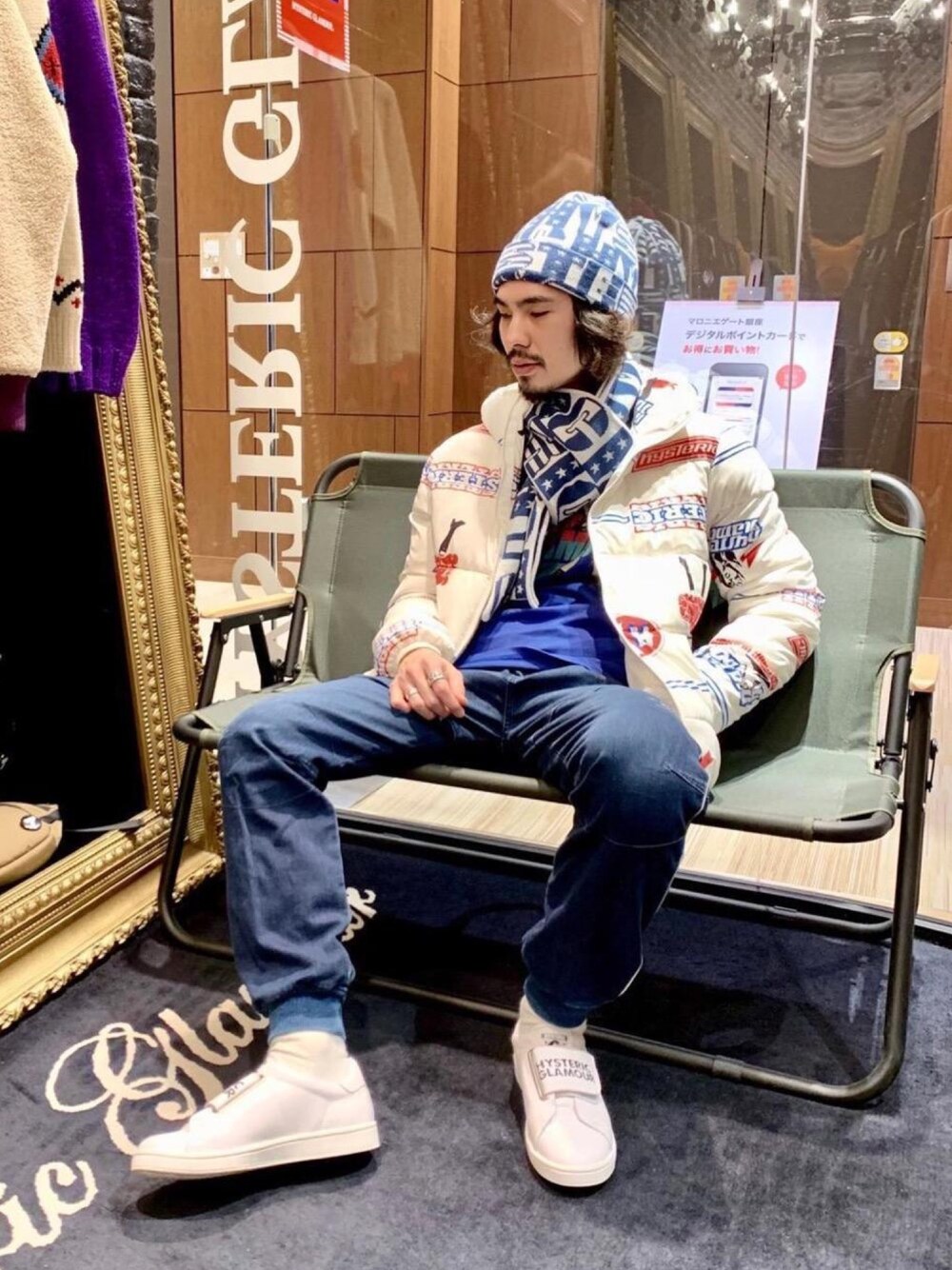 総柄のプリマロフトにイージーデニムパンツで、スポーティーに合わせました。マフラーとニットキャップはお揃いの柄でまとめると良いですね。