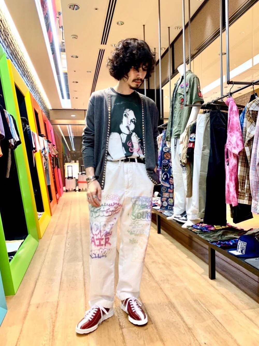 ロックテイストなトップスに、ワイド白パンでカジュアルダウンしました。