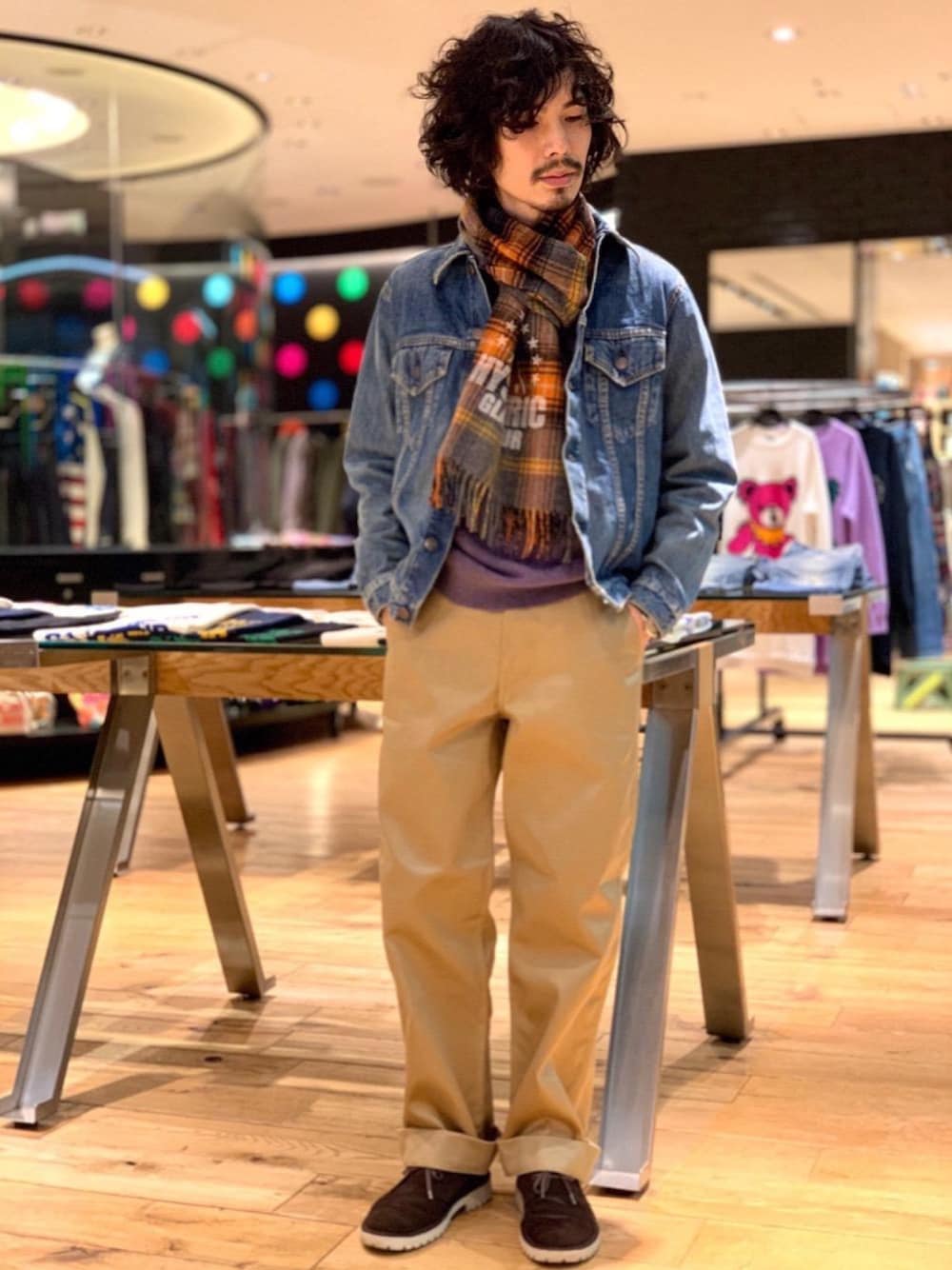 Gジャンとチノパンの鉄板アメカジコーデのアクセントに、ウールチェックマフラーをプラス。