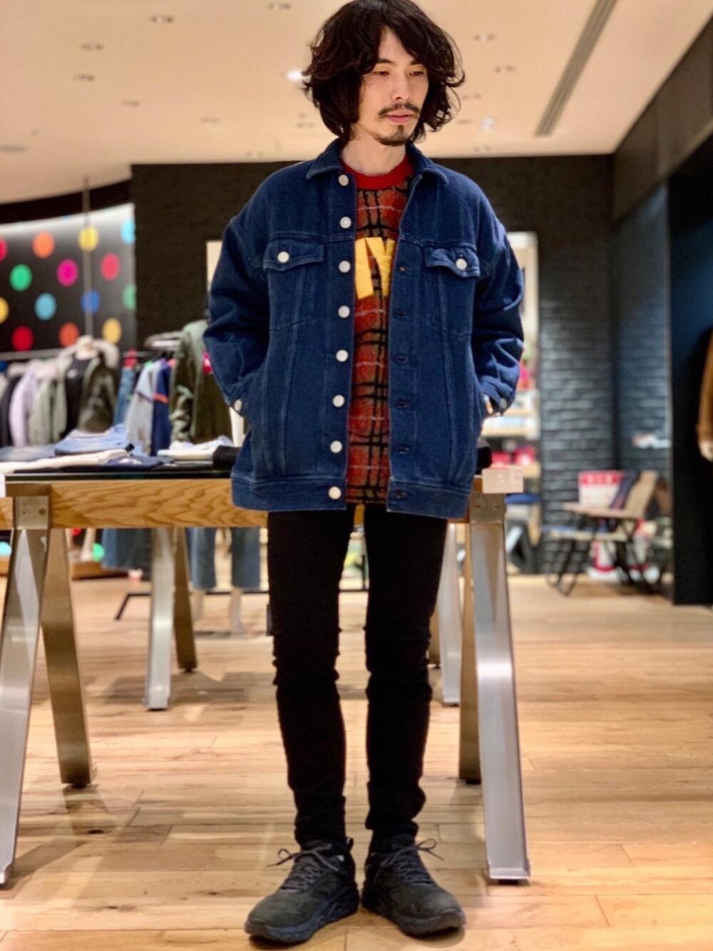 トップスのデニムジャケットとチェック柄ボアスウェットは、オーバーサイズで男女問わずに着ていただけます。ボトムスは黒スキニーでメリハリをつけました。