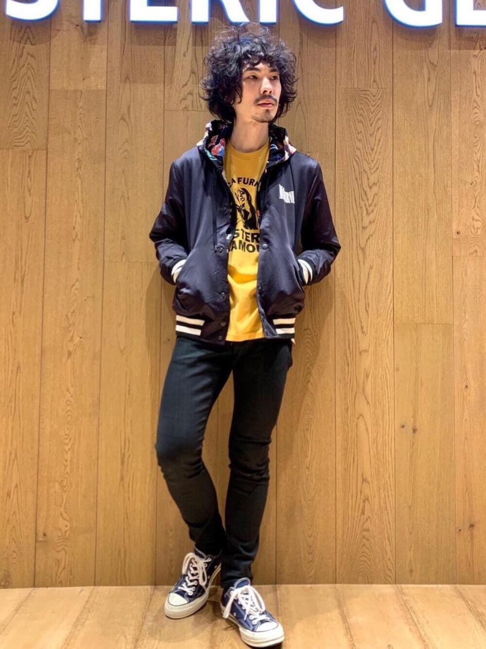 MODERNICA別注のサテンブルゾンとTシャツはシーズン幅広く活躍します。アクセントに総柄パーカーを挟みました。