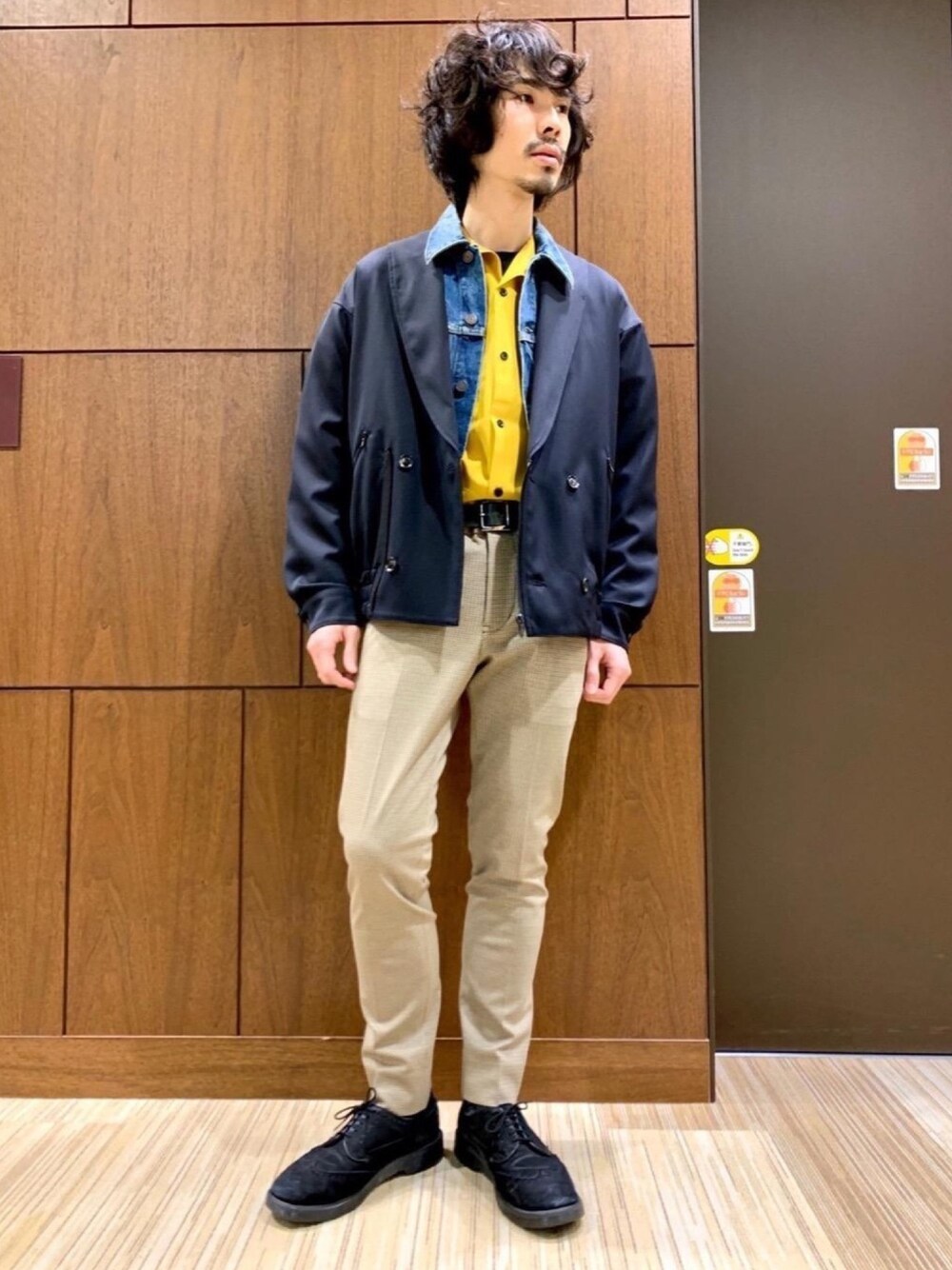 オーバーサイズのショールカラーブルゾンに、Gジャンとボーリングシャツをレイヤードしました。