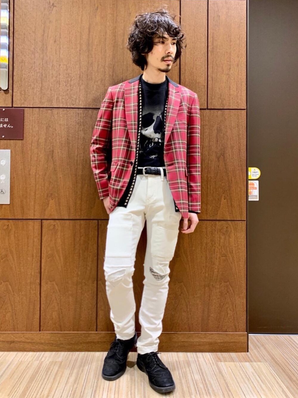 チェック柄のテーラードジャケットを、ロックテイストにまとめてみました。