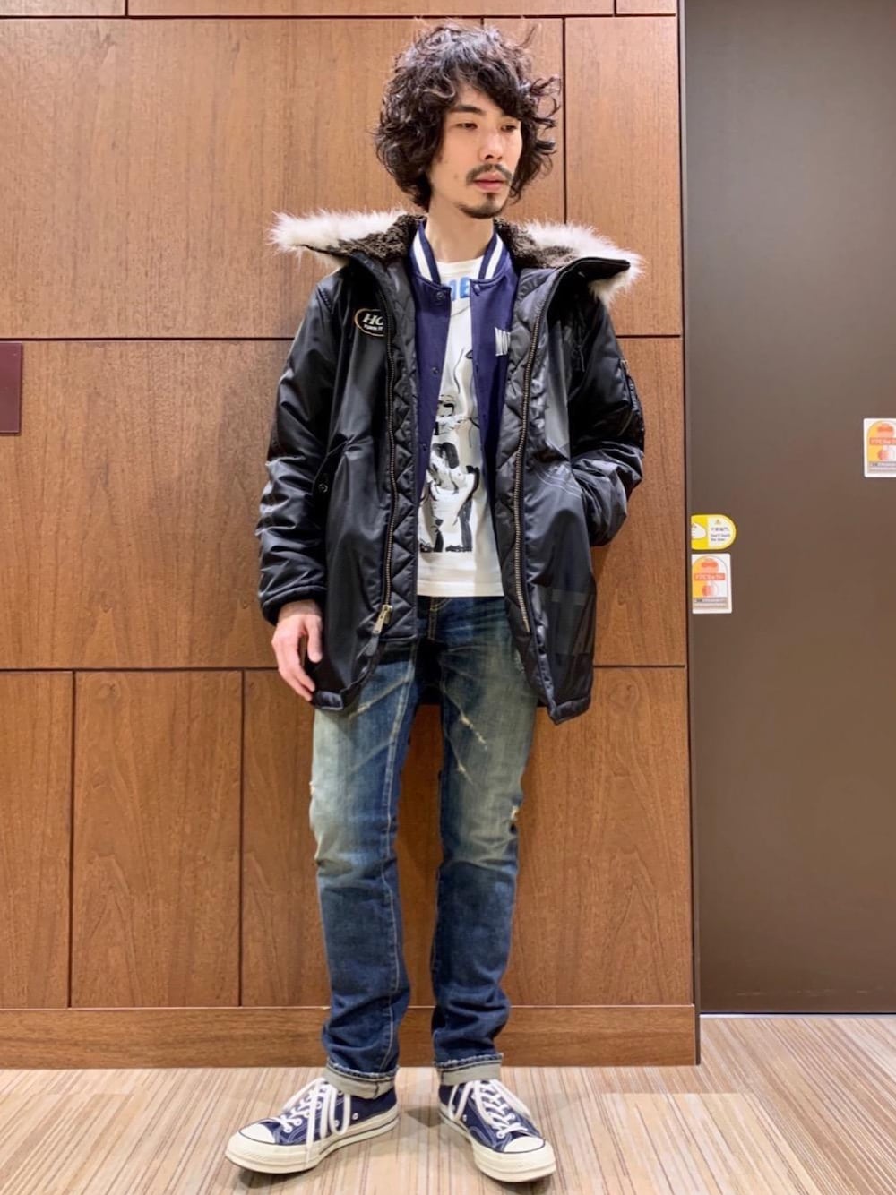 N-3Bコートのインナーに、MODERNICA別注サテンブルゾンをレイヤードしました。ダークカラーのリメイクデニムも、スッキリと見えるシルエットです。
