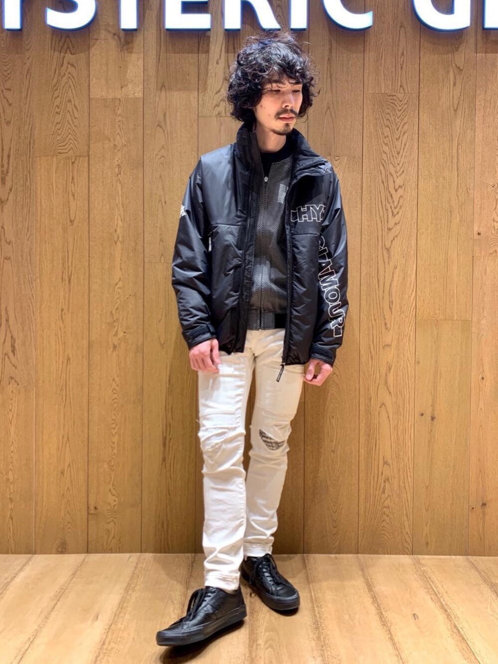 プリマロフト中綿入りのナイロンブルゾンを使ったモノトーンコーデ。ホワイトスリムパンツと合わせて軽さを出しました。