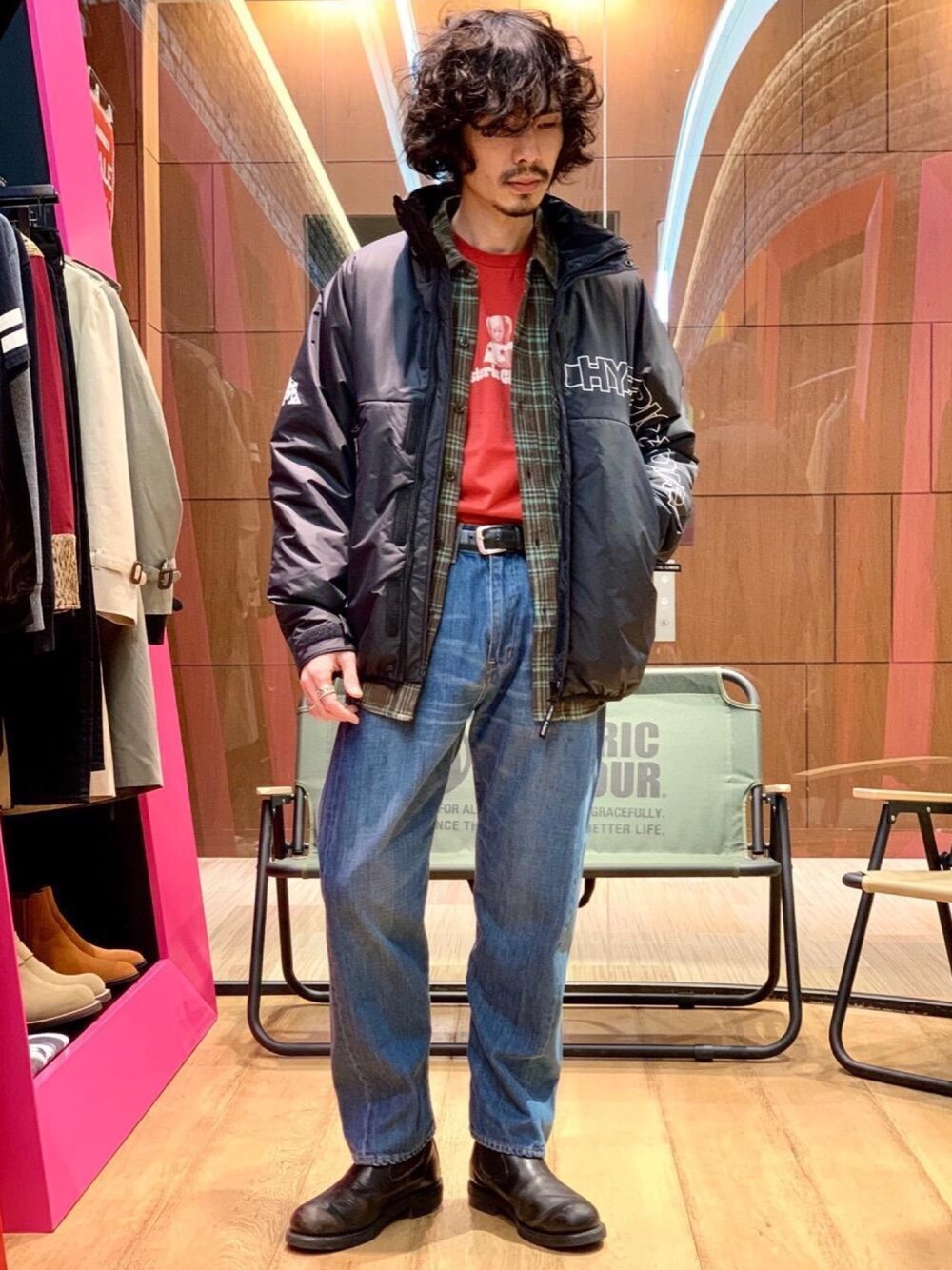 プリマロフトナイロンブルゾンに、チェックCPOシャツとテーパードデニムを合わせました。