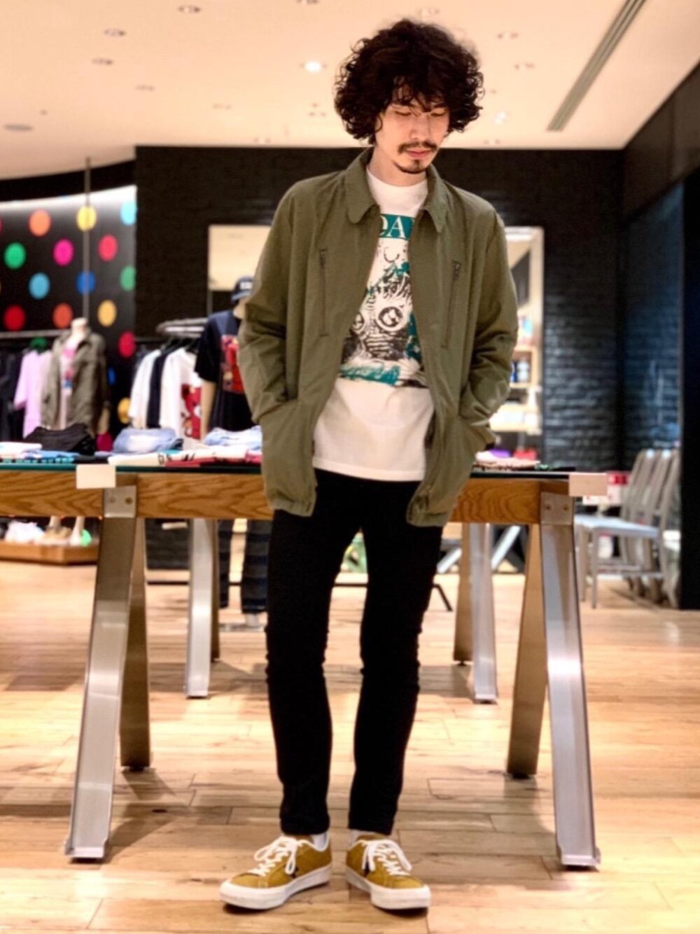 ジップ使いがポイントのミリタリージャケットは、1枚仕立てでサラリと羽織れます。黒スキニーパンツとバンドTシャツで、ロックに合わせました。