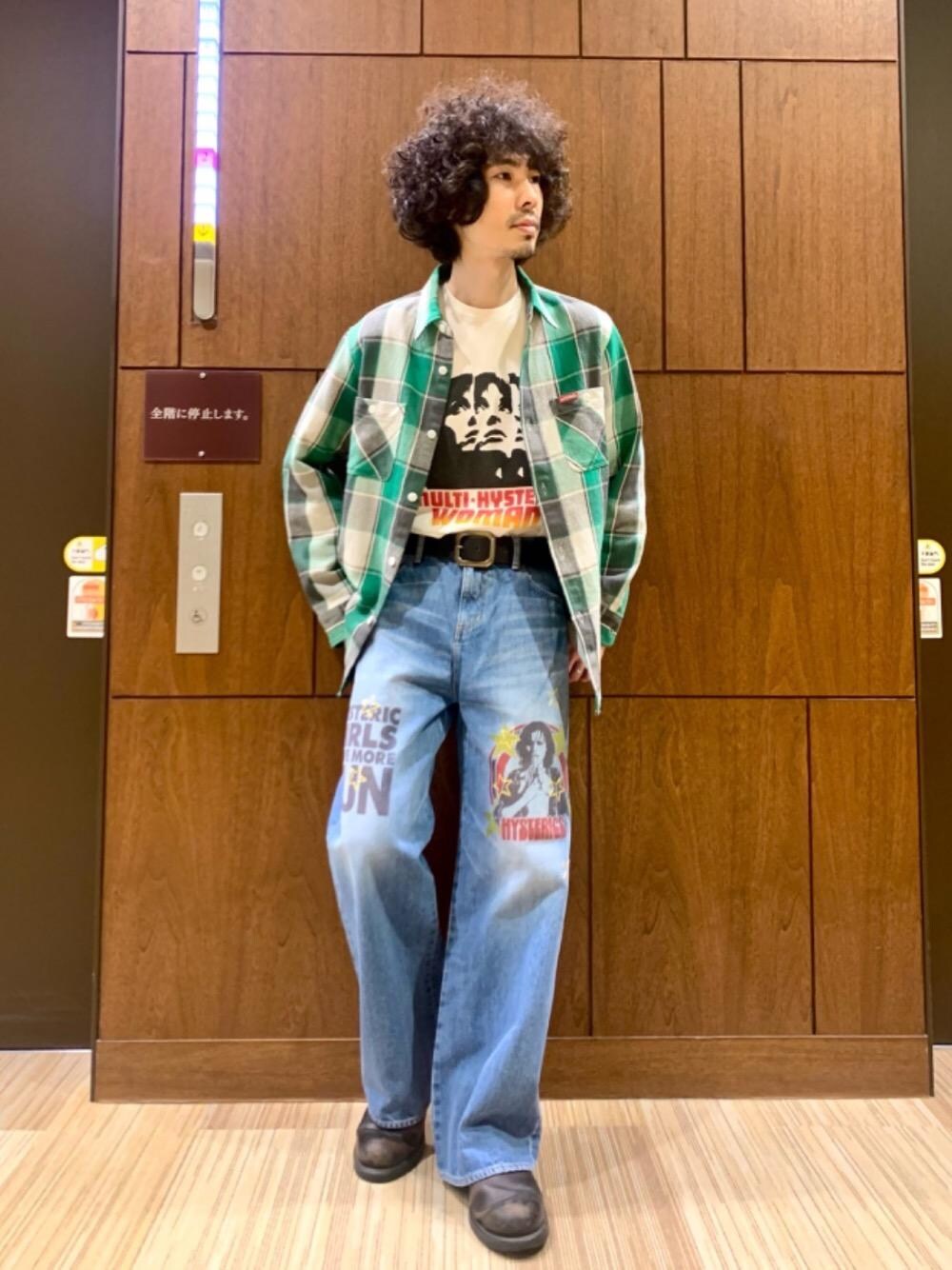 柔らかく着やすいチェックシャツに、グラフィックデザイン入りのワイドデニムを合わせました。デニムはレディースデザインですが、ゆとりがあるので男性の方でも穿いていただけます!