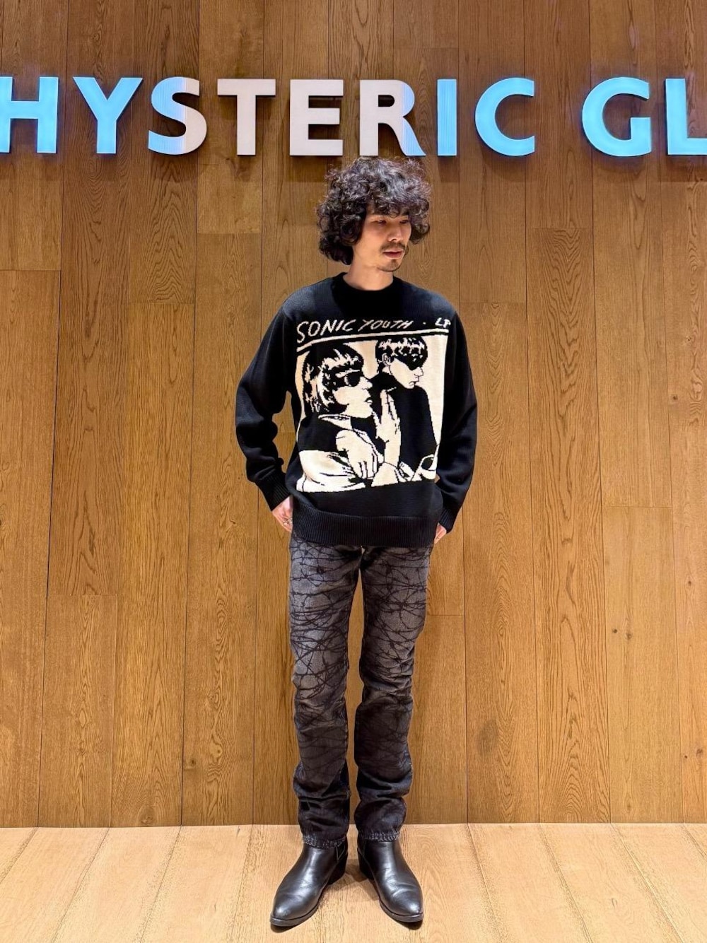 インパクト大のSONIC YOUTH編み込みセーターは、綿とポリエステル素材で着心地◎です。細身の有刺鉄線プリントジーンズは、ロックコーデに最適です!