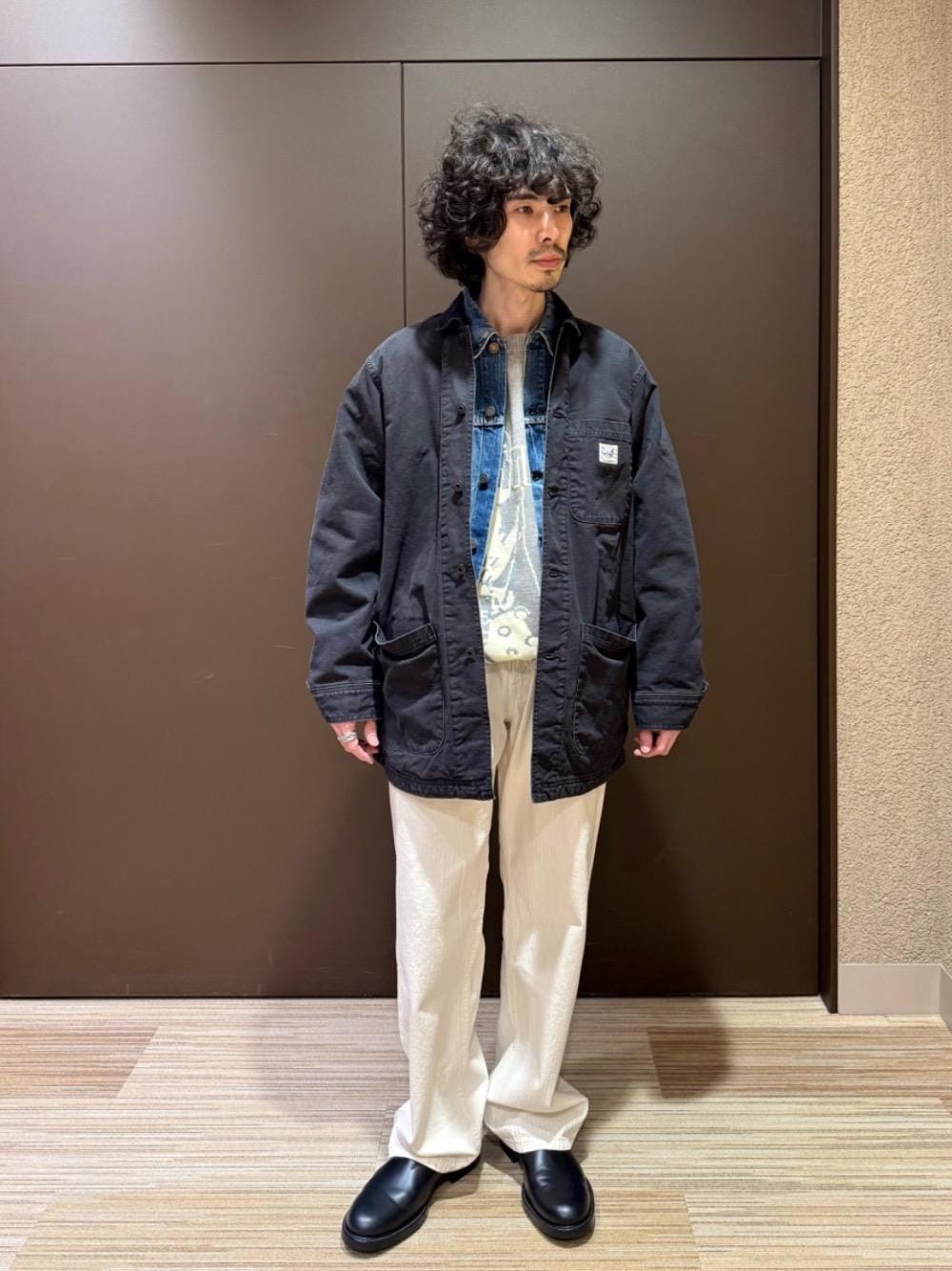 セーターとデニムジャケットの上に、裏ボアカバーオールジャケットをコート感覚で羽織れば、厳しい寒さの日も乗り切れます!